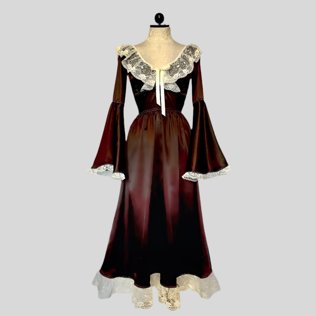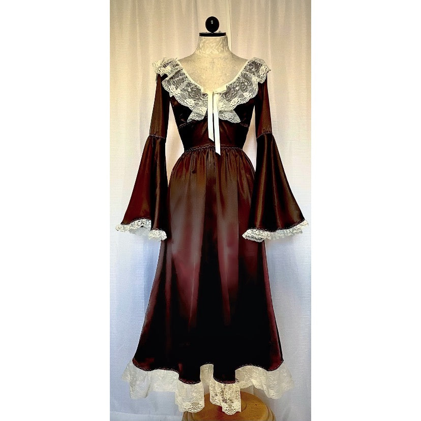 Introducing the floor length Deidre Dress in rich brown. She is inspired after a vintage gown and made with charmeuse satin. With a fitted waist, bell sleeve, ruffle lace detailing and ribbon bow tie front, she’s going to make you feel like the belle of the ball