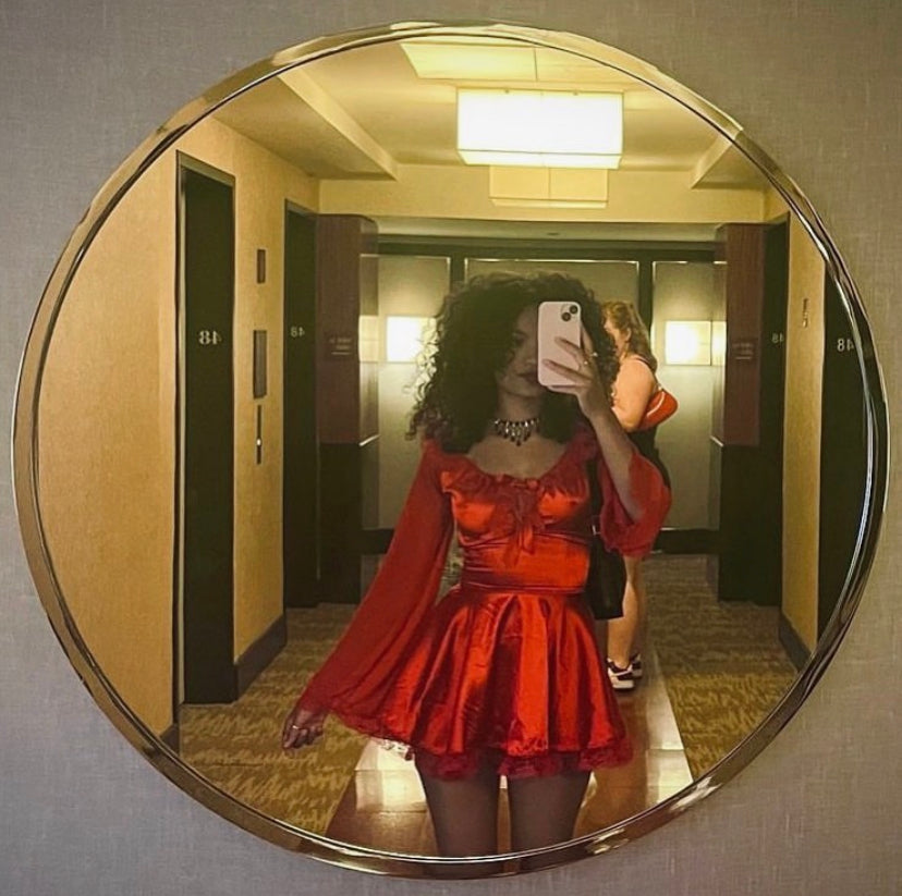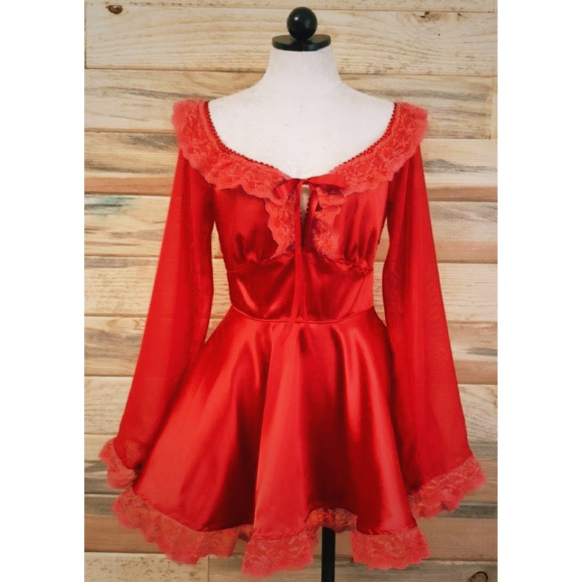 Satin and lace, bell sleeve, off shoulder dress. Ribbon detailing