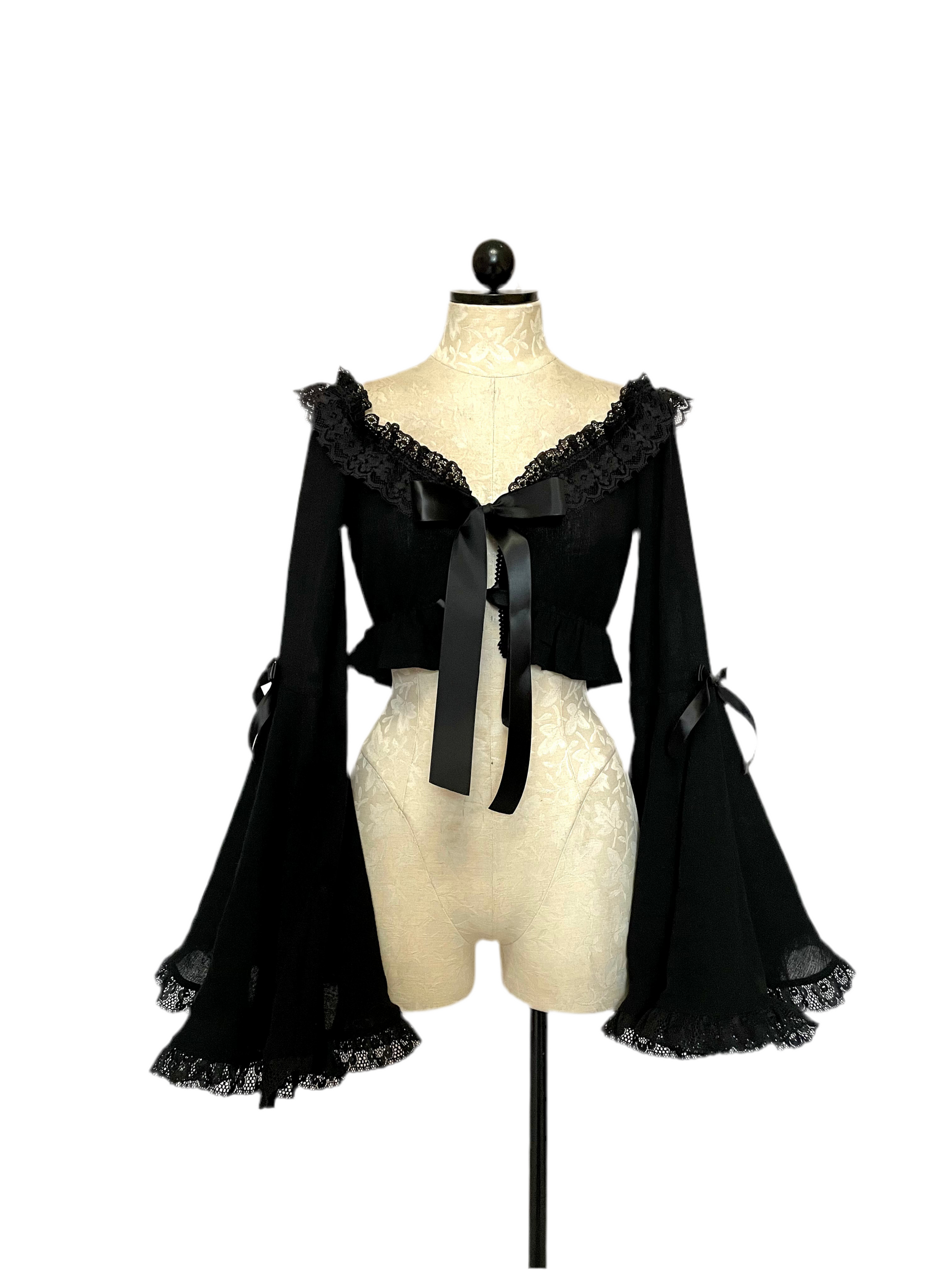 Stop the show and take a look at this beauty. Meet the Roselyn Top. She is a mystery and a blast. Roselyn is a crop top made with a gorgeous gauze stretch cotton, accompanied with a dramatic bell sleeved, Raschel ruffled lace trim, all tied together with a satin bow tie front.