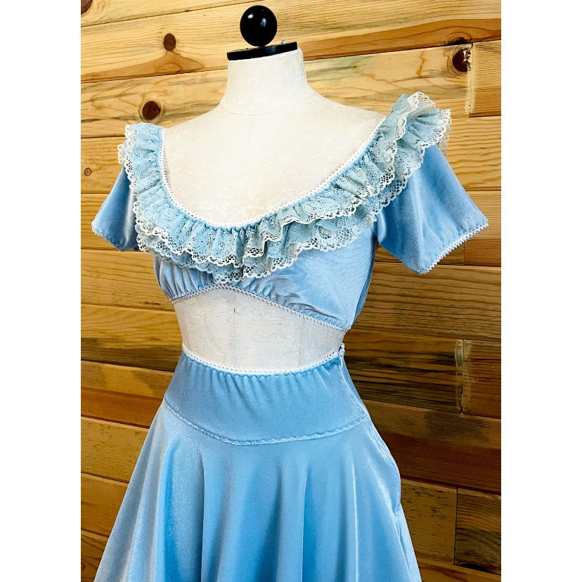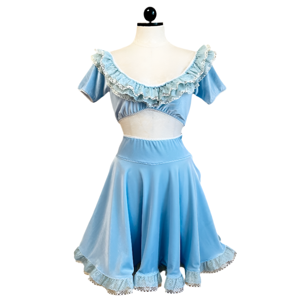The Allison Set is the flirty younger sister of the beloved Allison Dress. She’s a little more playful, featuring a stretch velvet crop-tie top, paired with a matching circle skirt, both beautifully enhanced with double ruffled lace details. If you’re looking for a little mischief with your peace-love-and-babydolls, stick with her, she won’t let you down.
