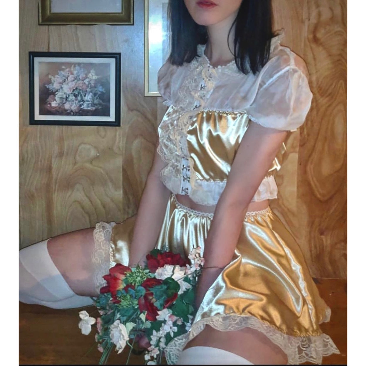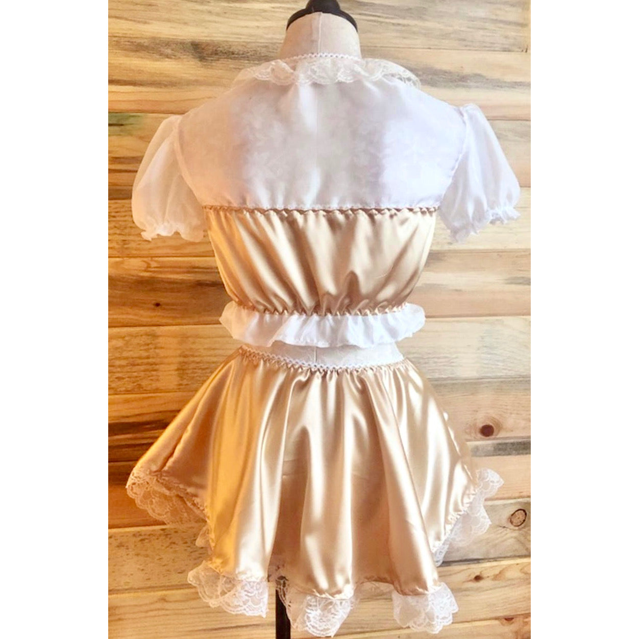 The Antoinette Clasp Set: Treat yourself with beauty and playfulness with our seductive Antoinette Set. A bed jacket crafted with a combination of chiffon and satin, featuring hook and eye closures to add a little edge. Paired with a matching skirt adorned with a ruffled lace trim, she is a little naughty but oh-so-nice. Prepare for your heart to race as Antoinette leads you into a realm of provocation.