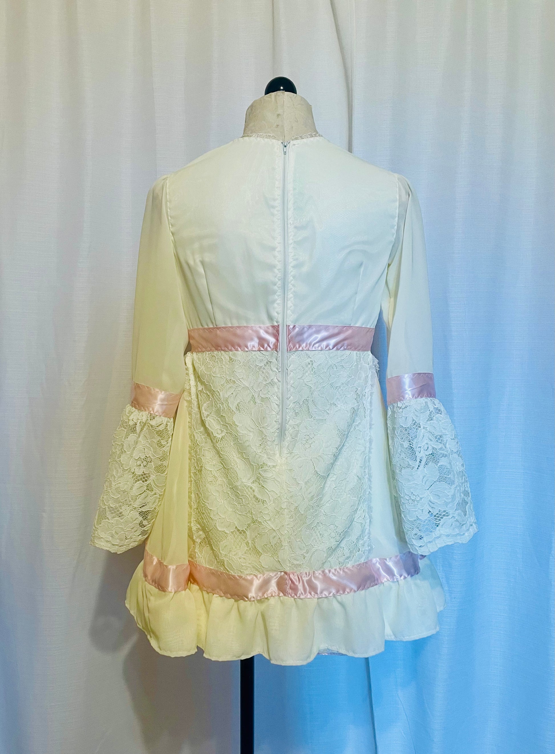 60’s style lace, chiffon and satin babydoll with ribbon accents.