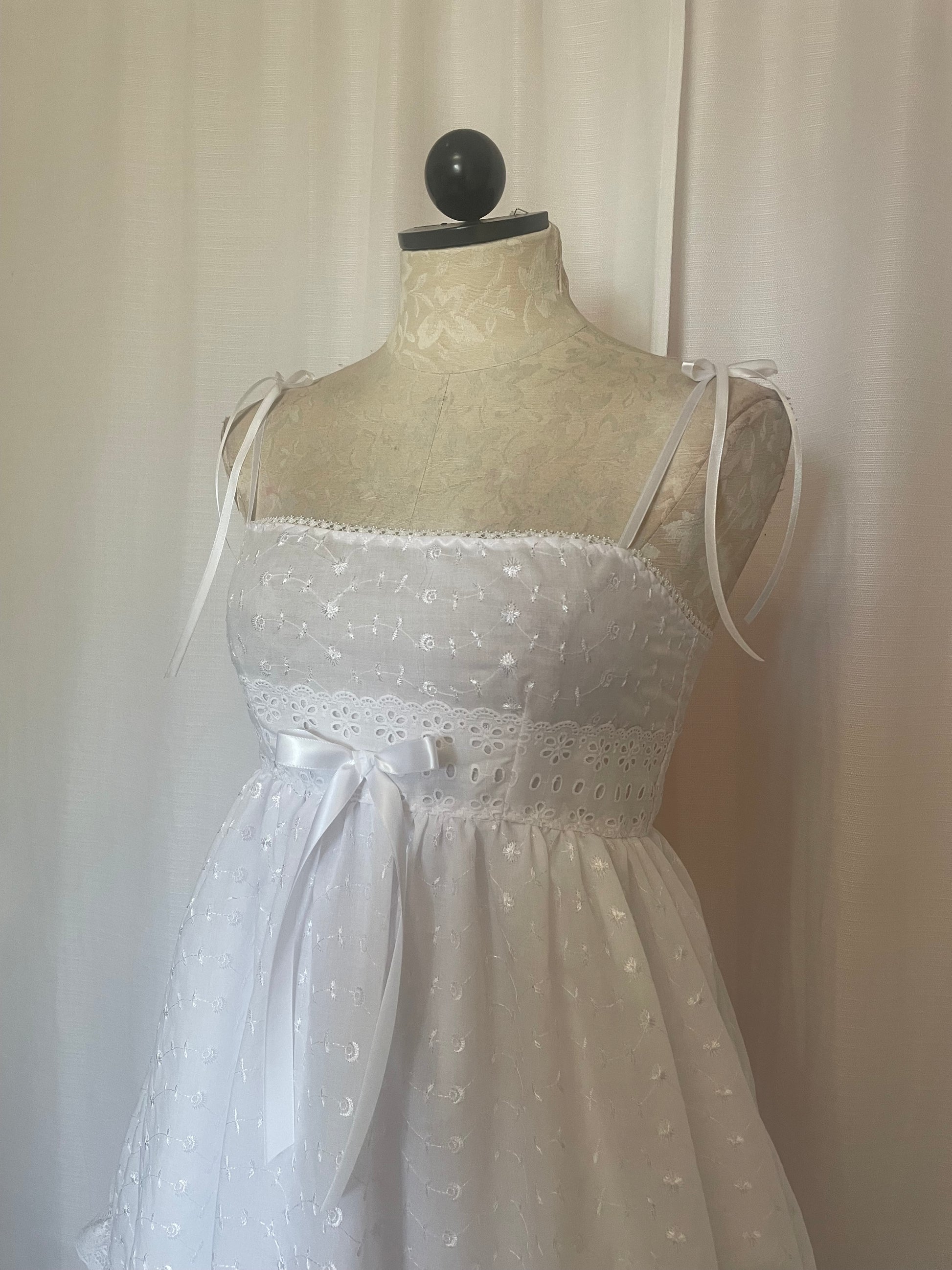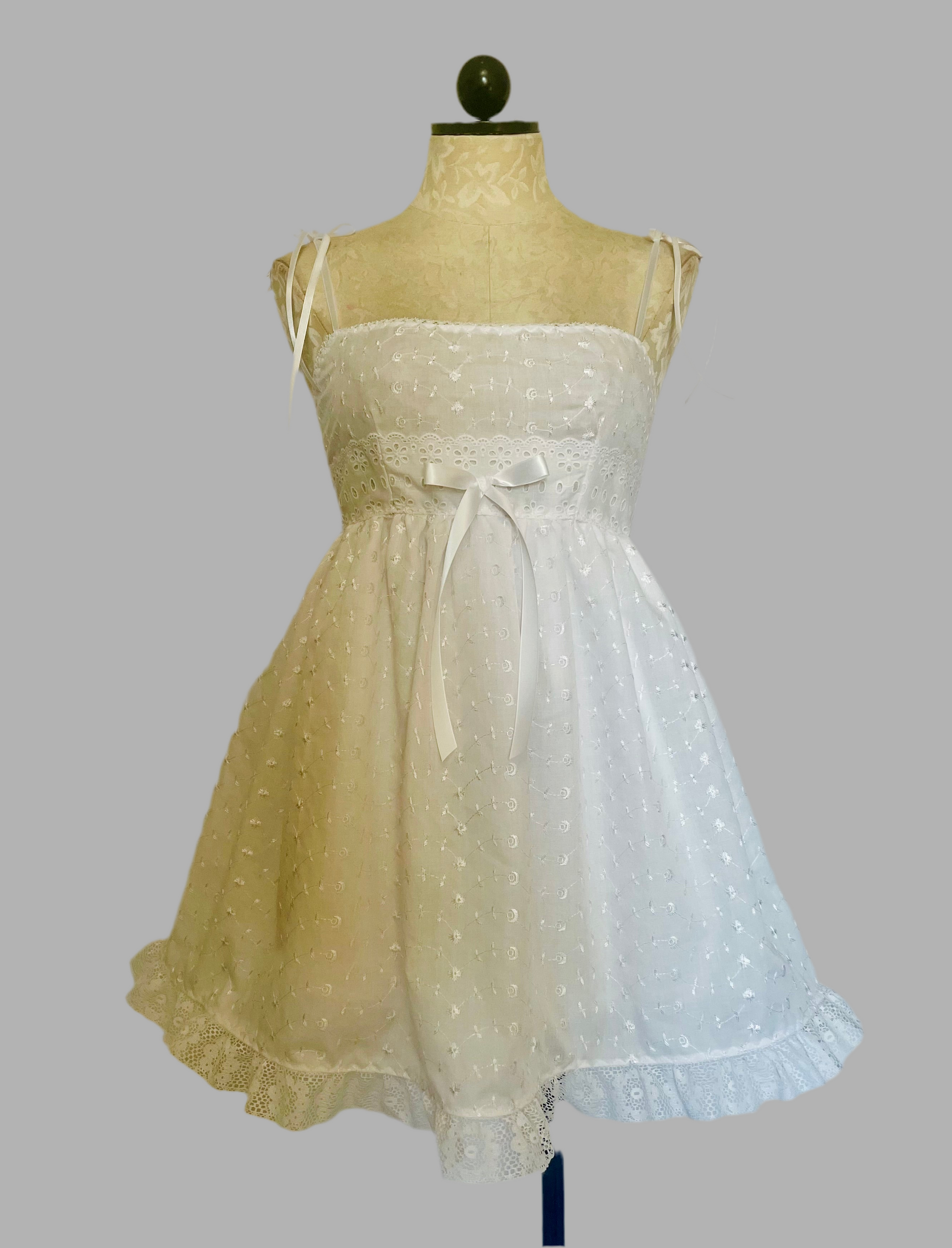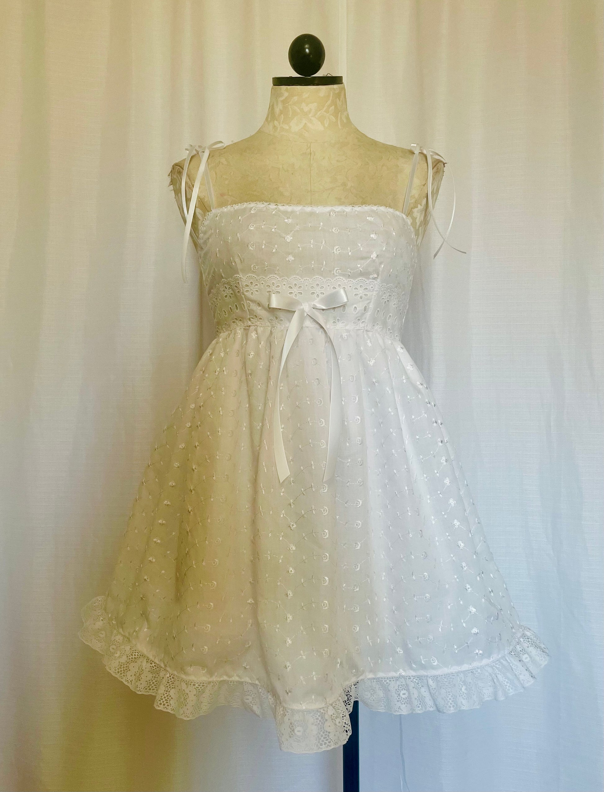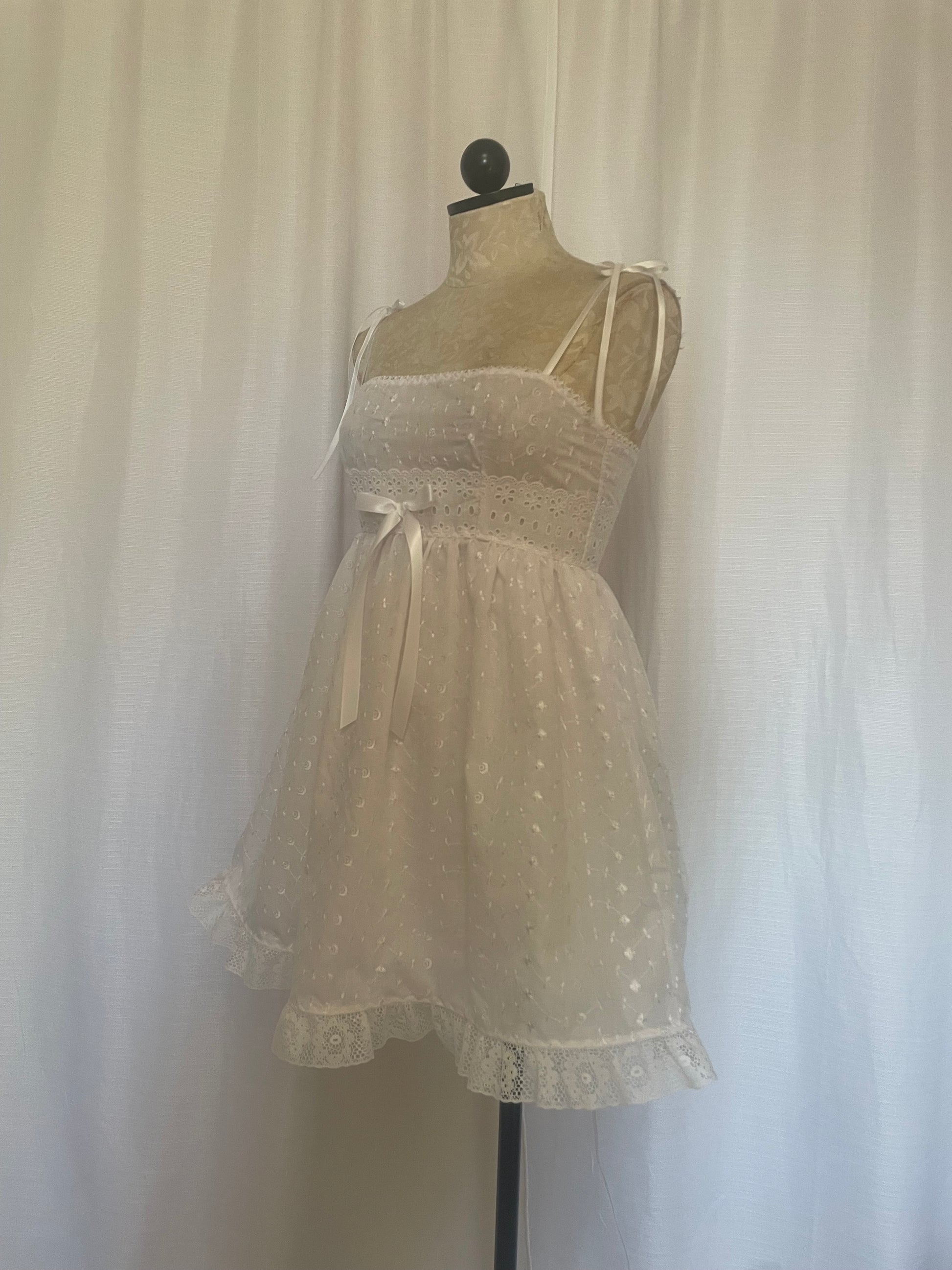 Cotton eyelet babydoll dress with spaghetti straps.