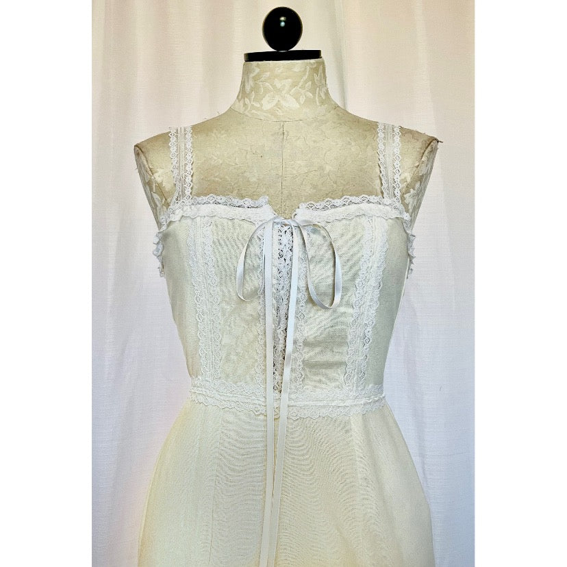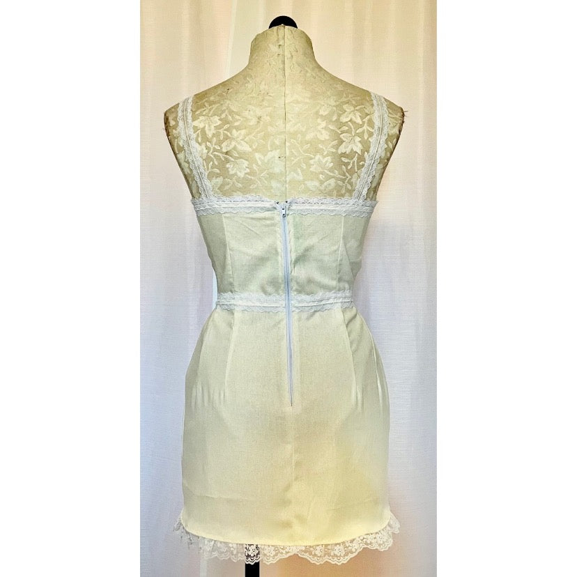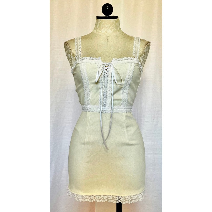 Linen mini dress with corseted satin ribbon bust and lace details