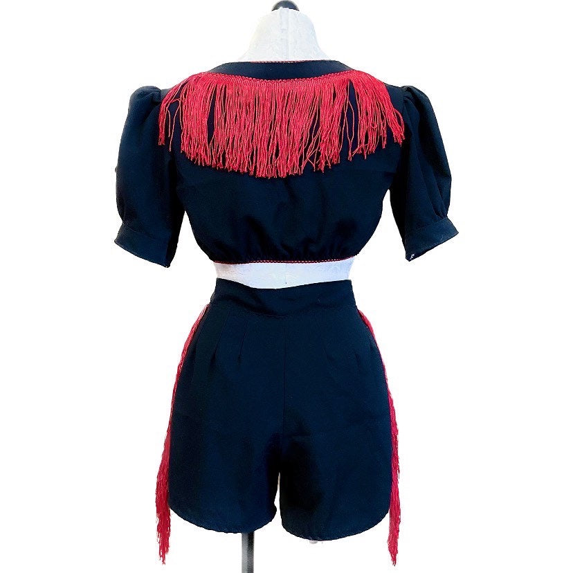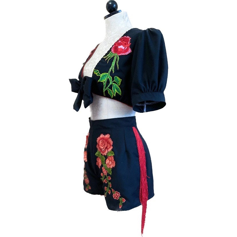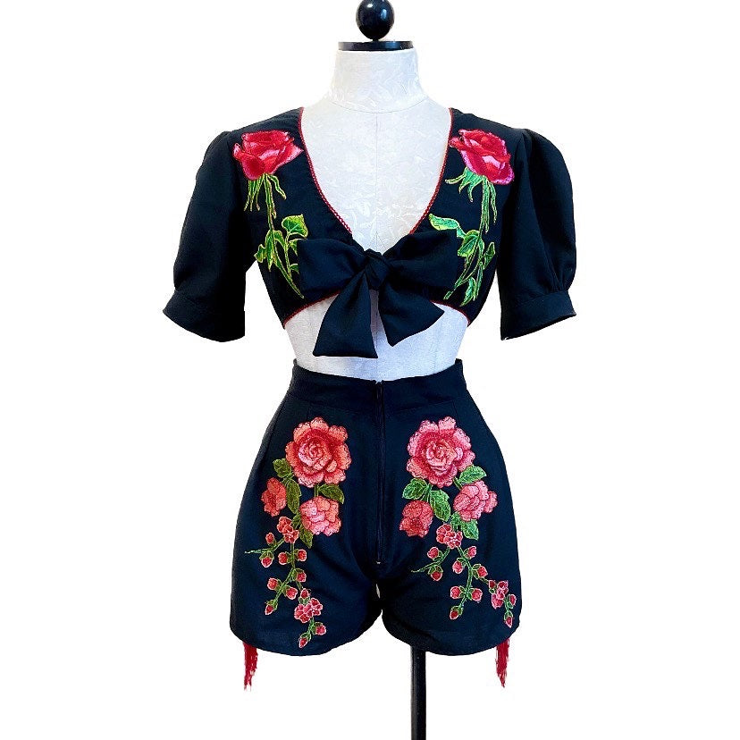 Vintage country inspired short set. Cropped linen tie top with embroidered roses and fringe detailing with matching embroidered, fringed high rise shorts