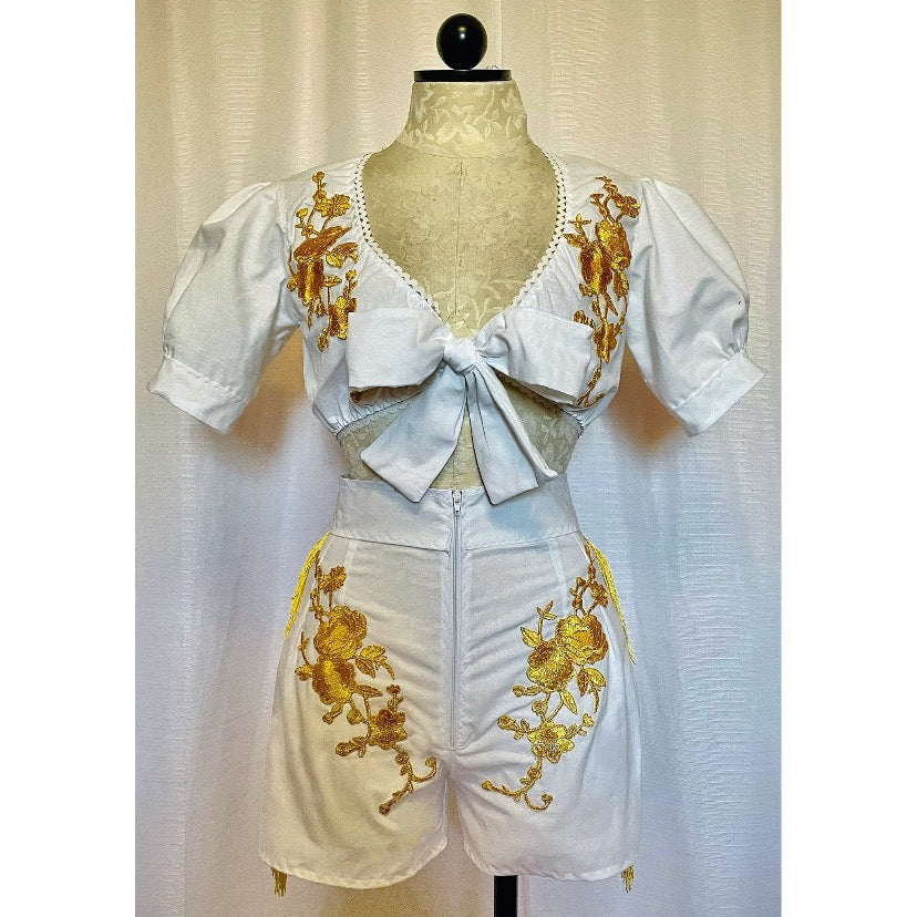 Vintage country inspired short set. Cropped linen tie top with embroidered roses and fringe detailing with matching embroidered, fringed high rise shorts
