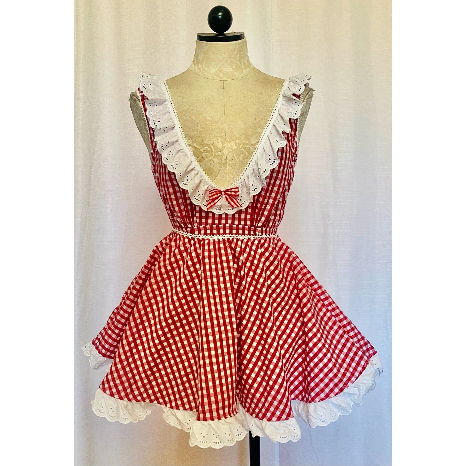 Gingham cotton retro style bodysuit with ruffled eyelet trim (can be made with matching detachable skirt)