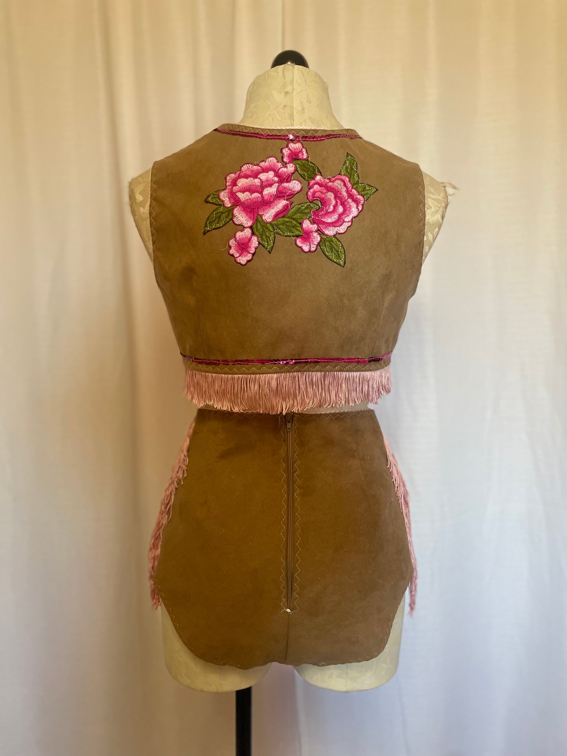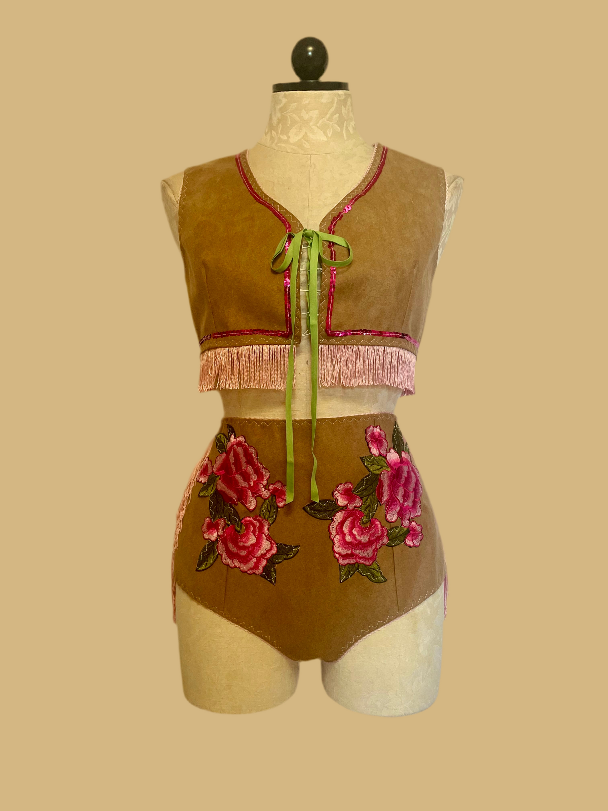 Vintage Cowgirl inspired suede crop top with matching tap pant. Fringe, sequined and rose appliqué detailing.