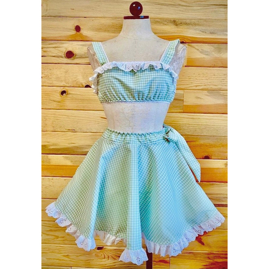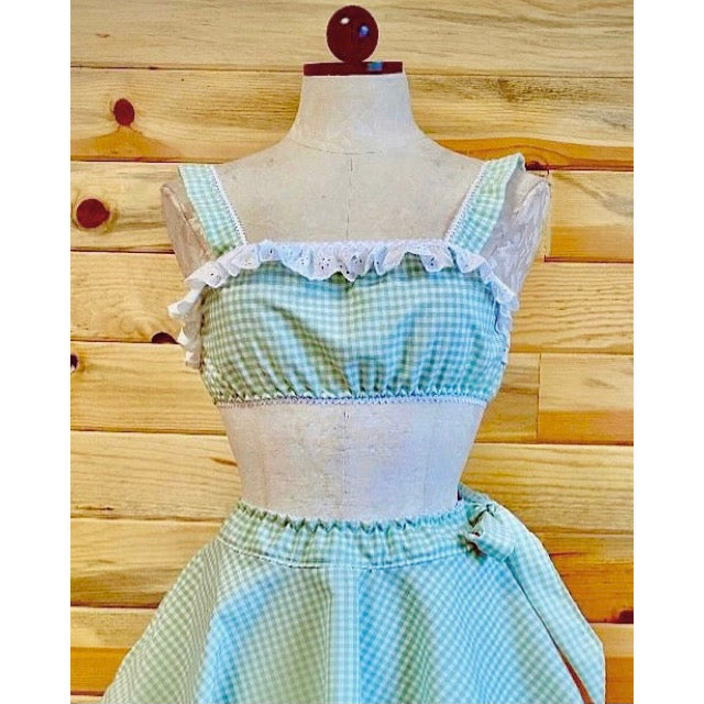 Gingham cotton top and mini skirt with eyelet cotton trim