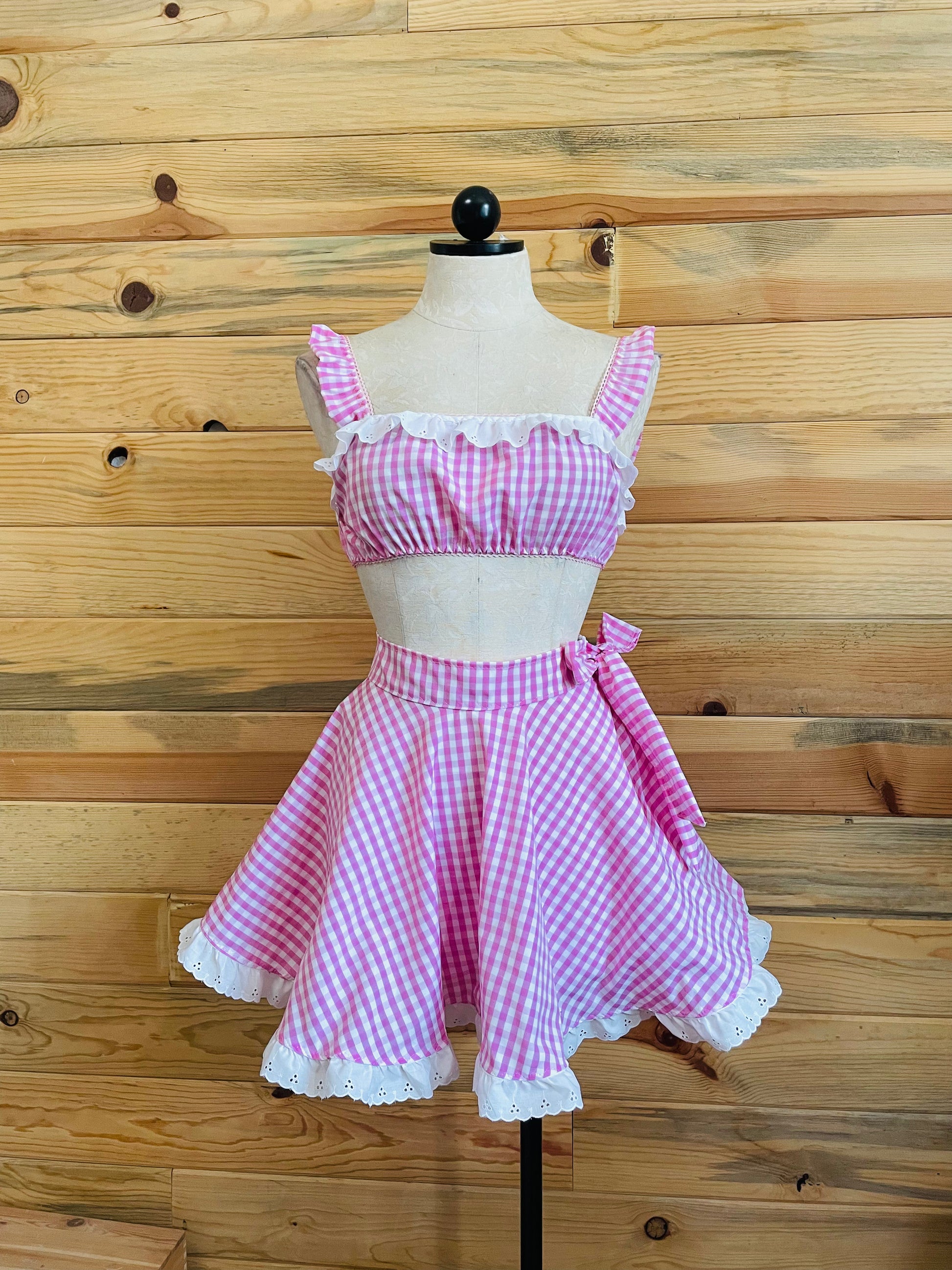Gingham cotton top and mini skirt with eyelet cotton trim
