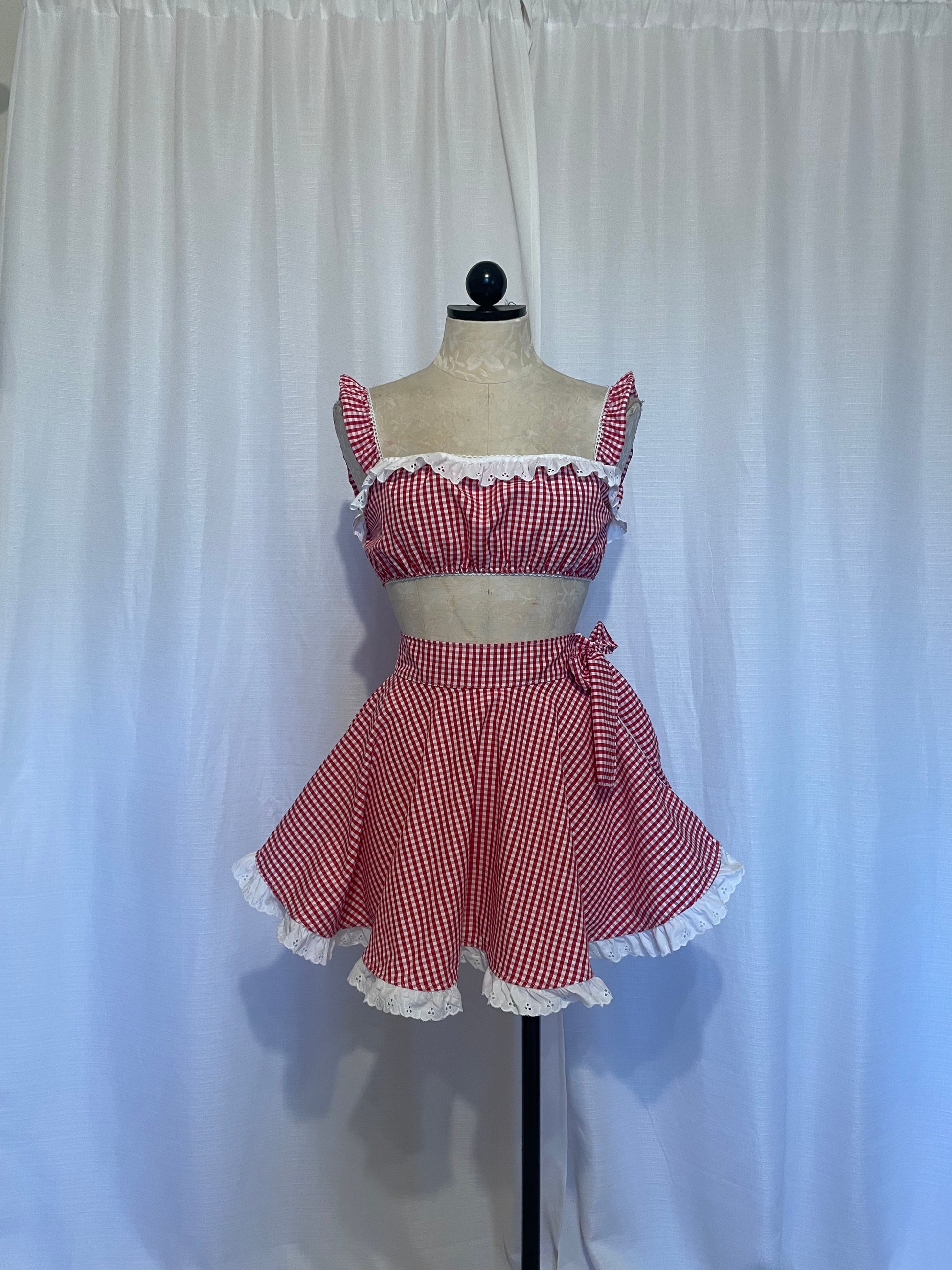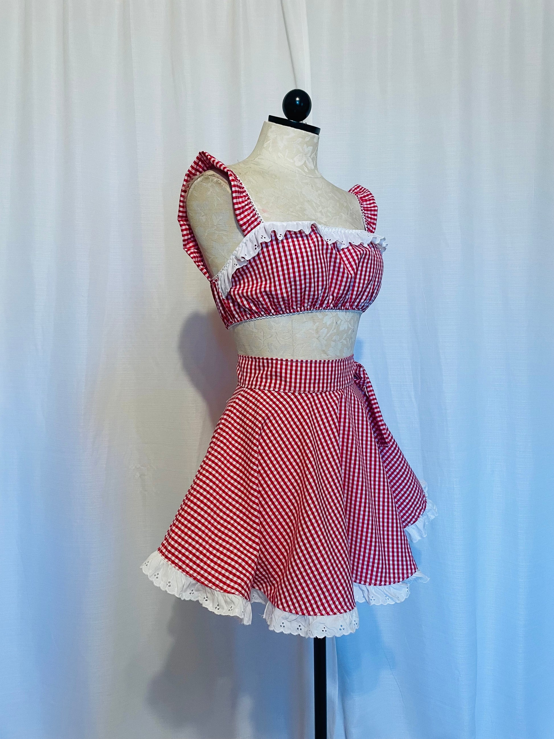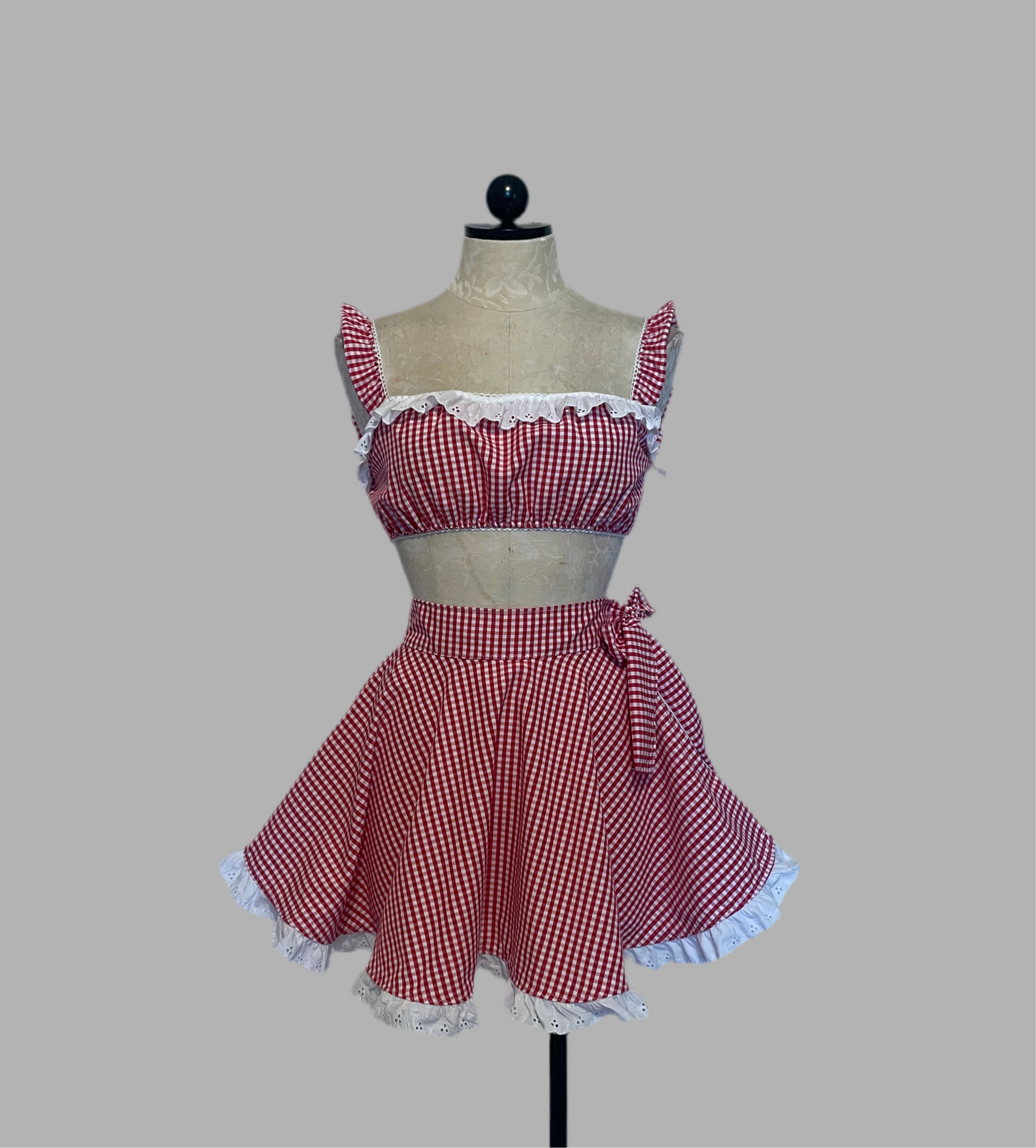 Gingham cotton top and mini skirt with eyelet cotton trim