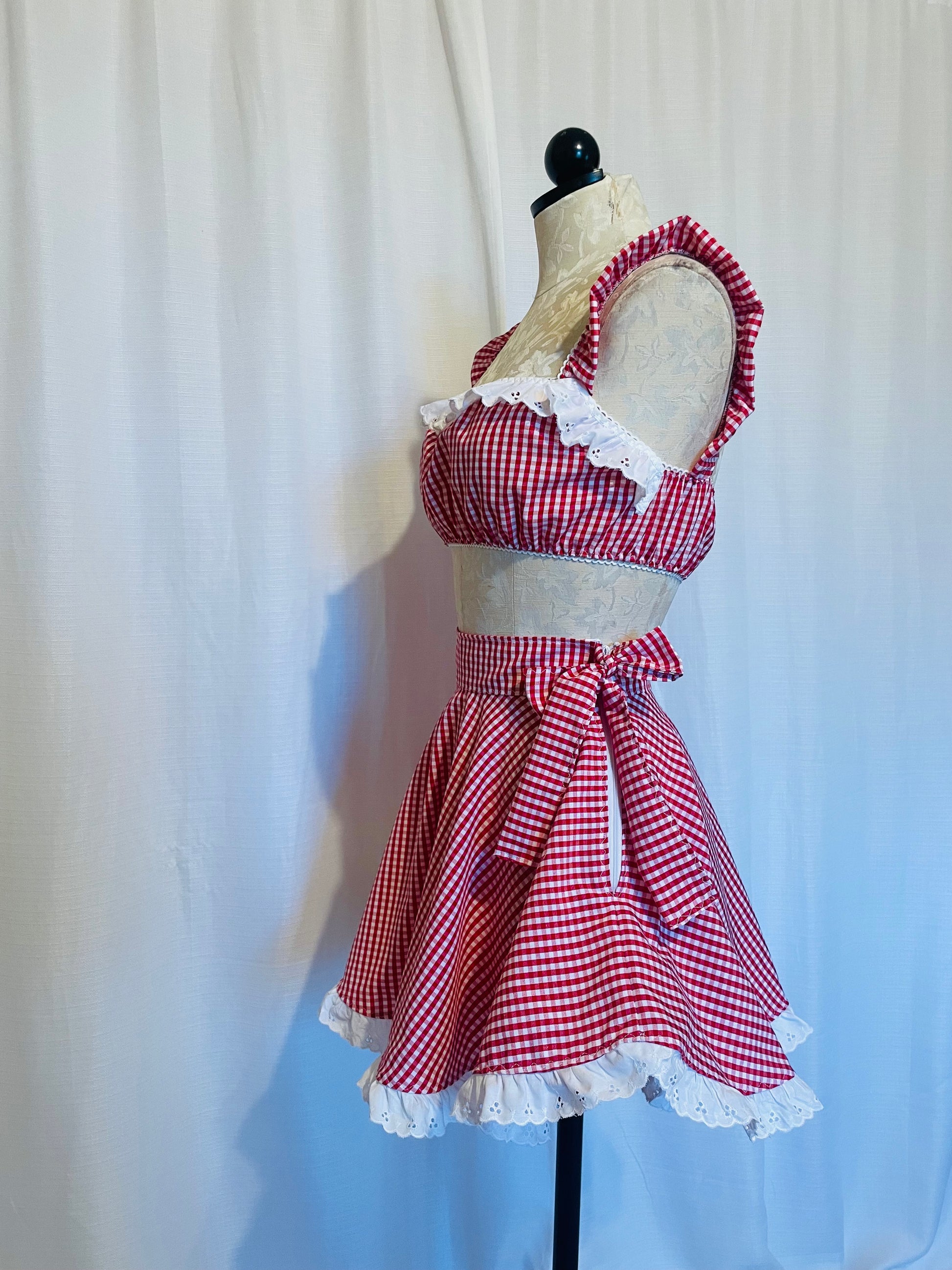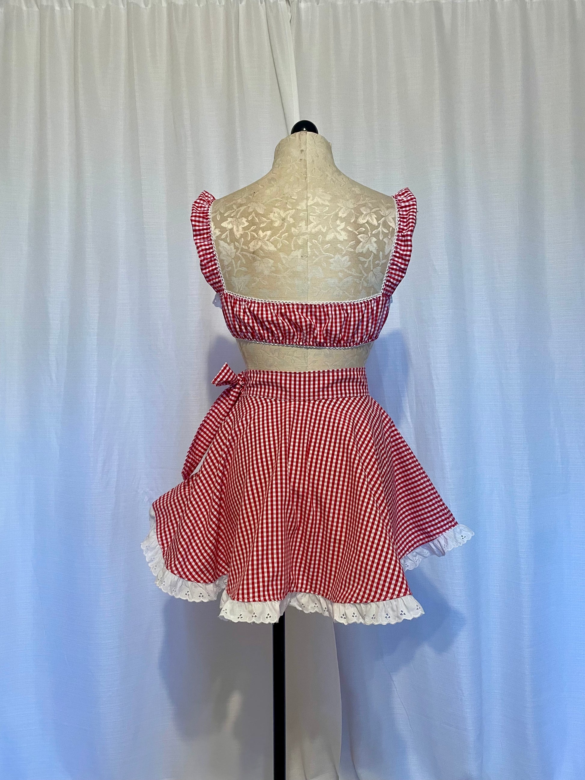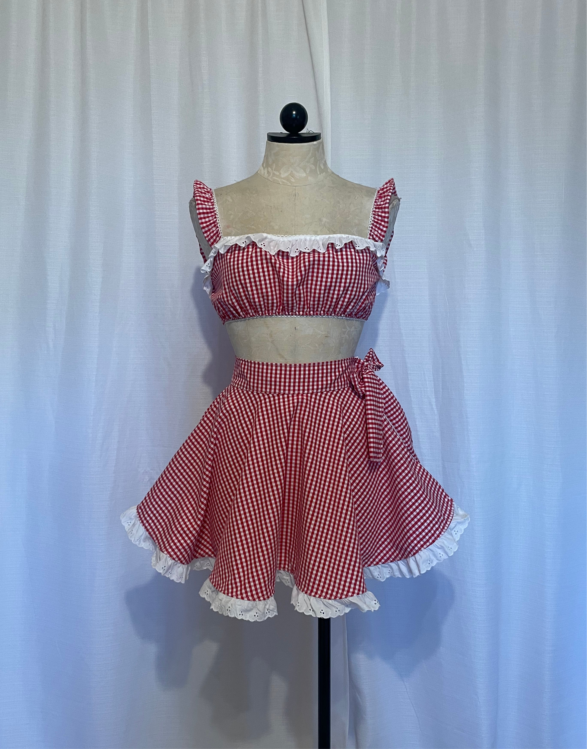 Gingham cotton top and mini skirt with eyelet cotton trim