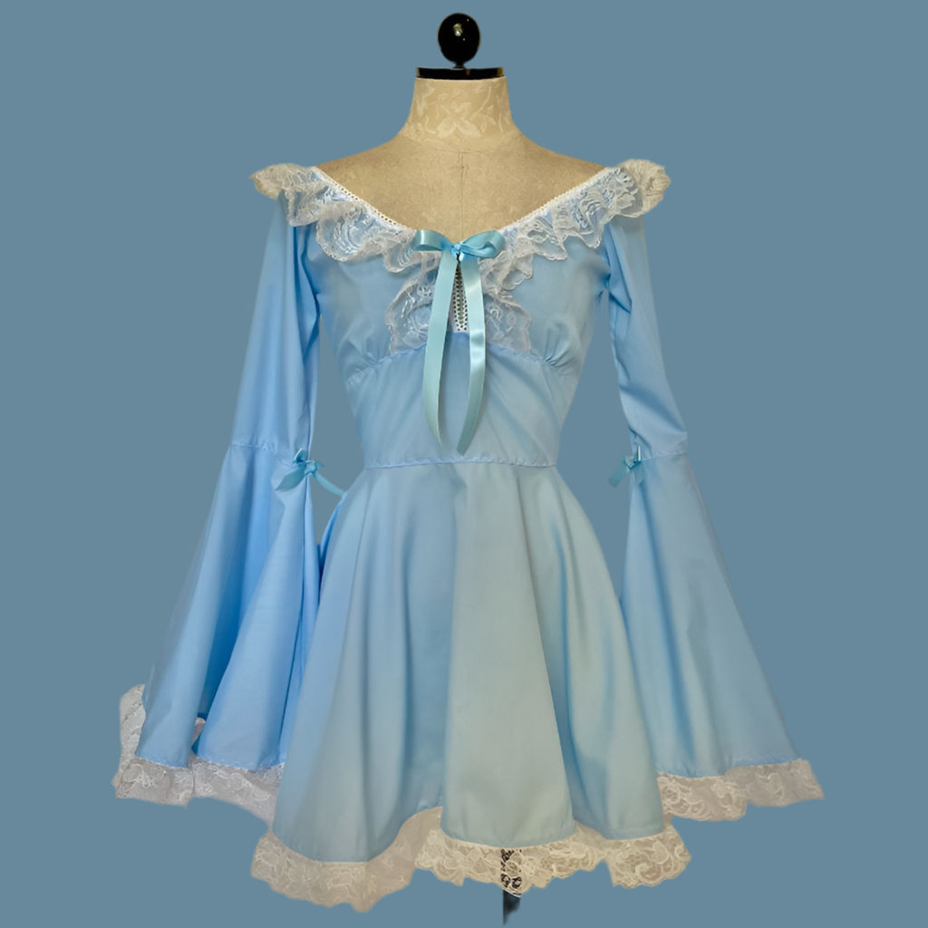 Vintage style cotton dress with fitted waist, bell sleeve, ruffle lace detailing and ribbon bow tie front