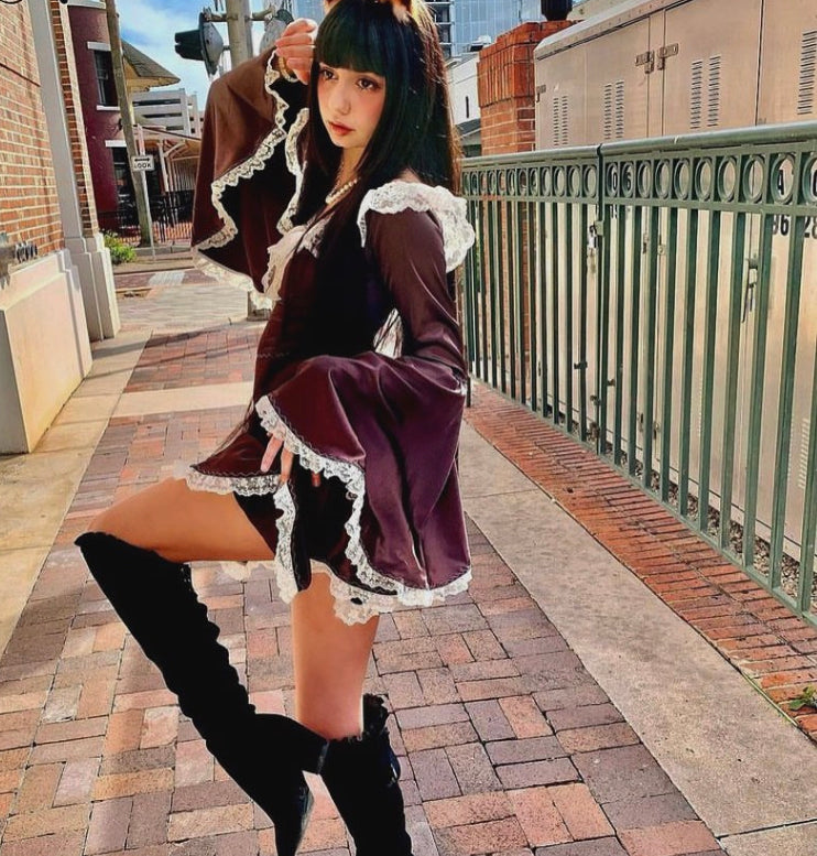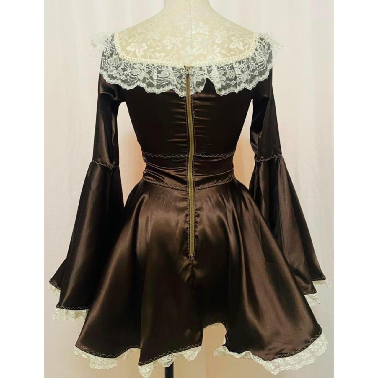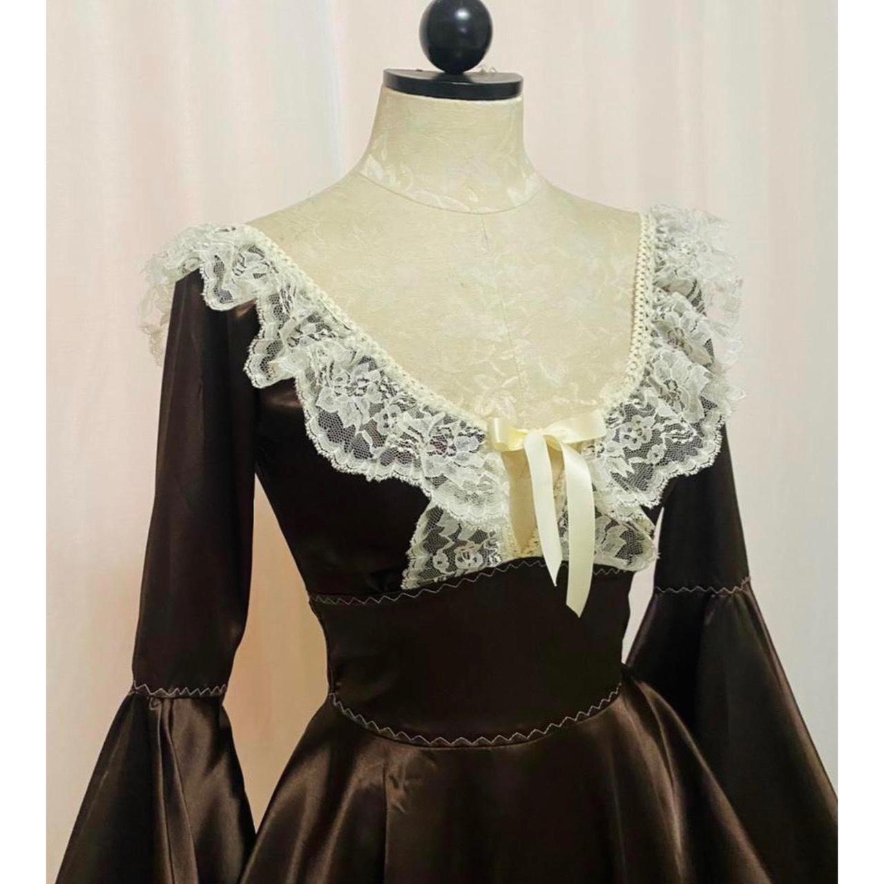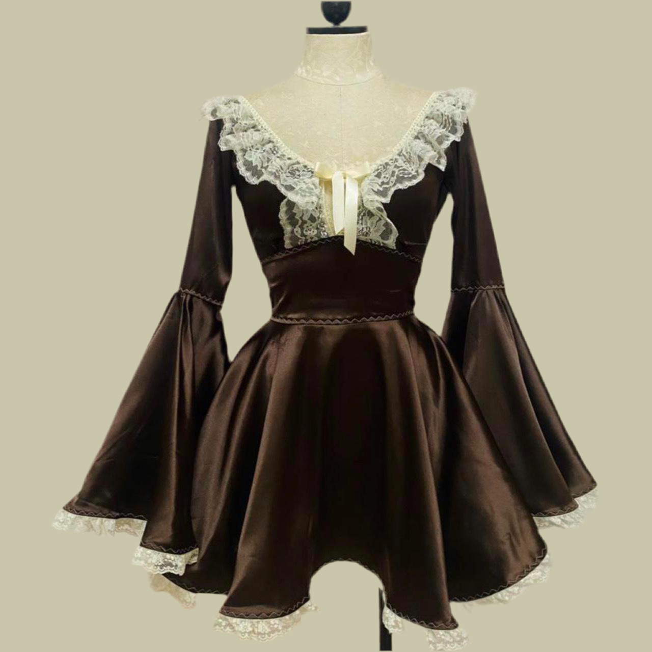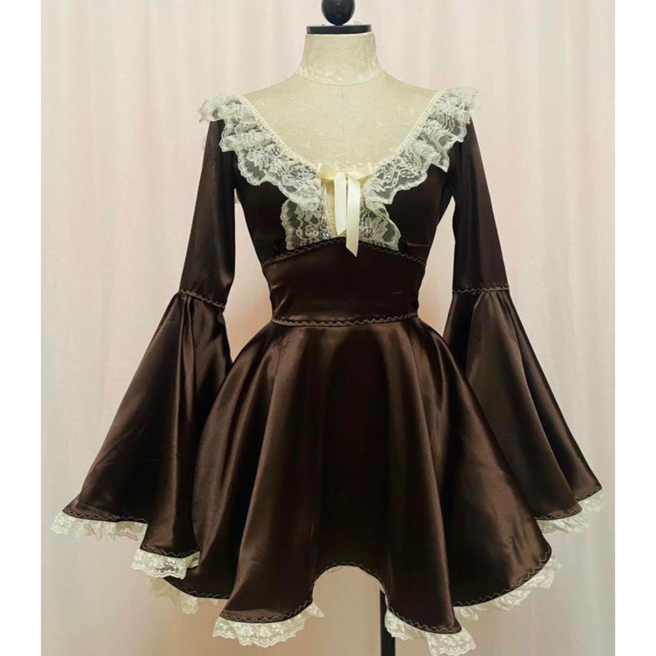 Vintage style charmeuse satin dress with fitted waist, bell sleeve, ruffle lace detailing and ribbon bow tie front