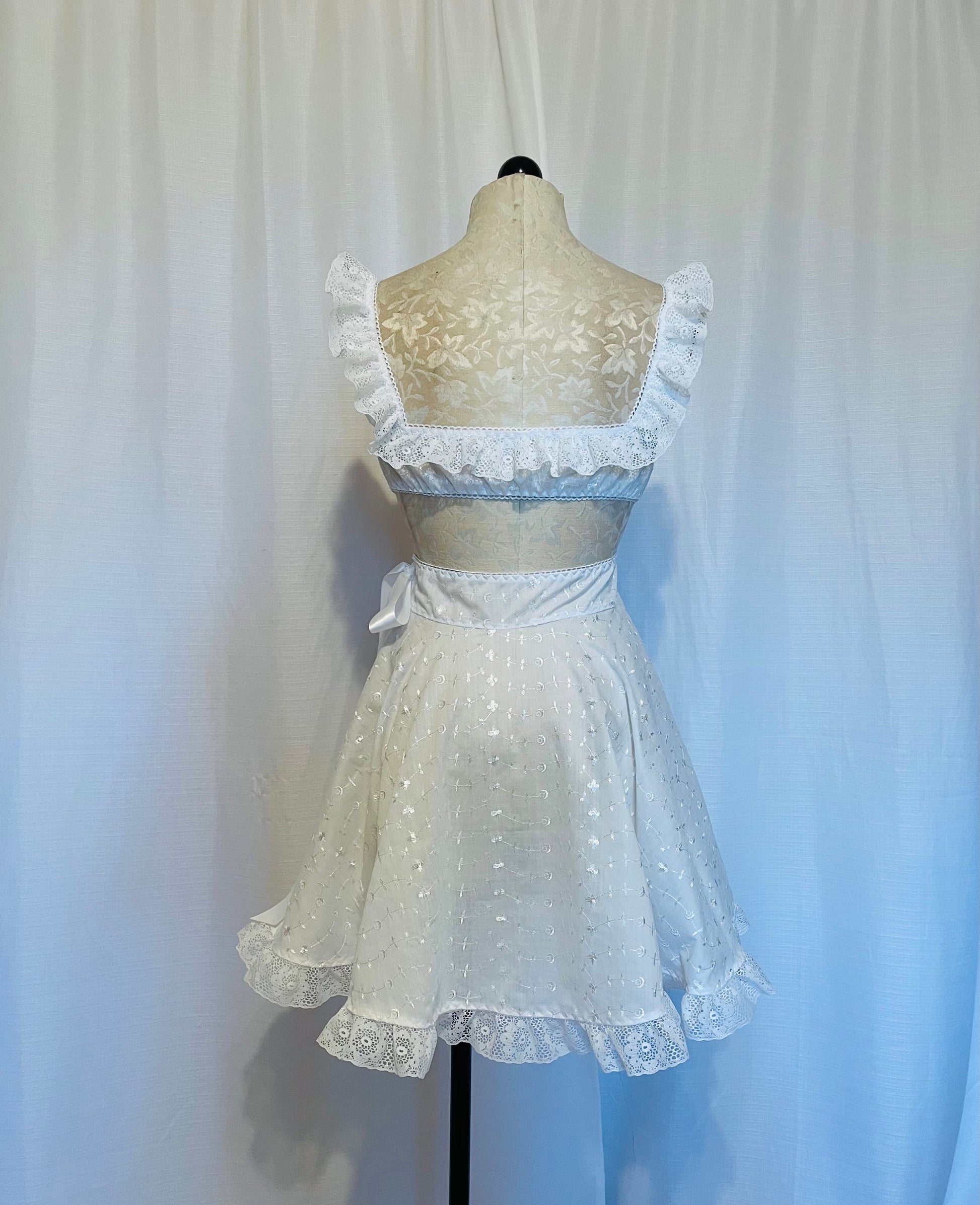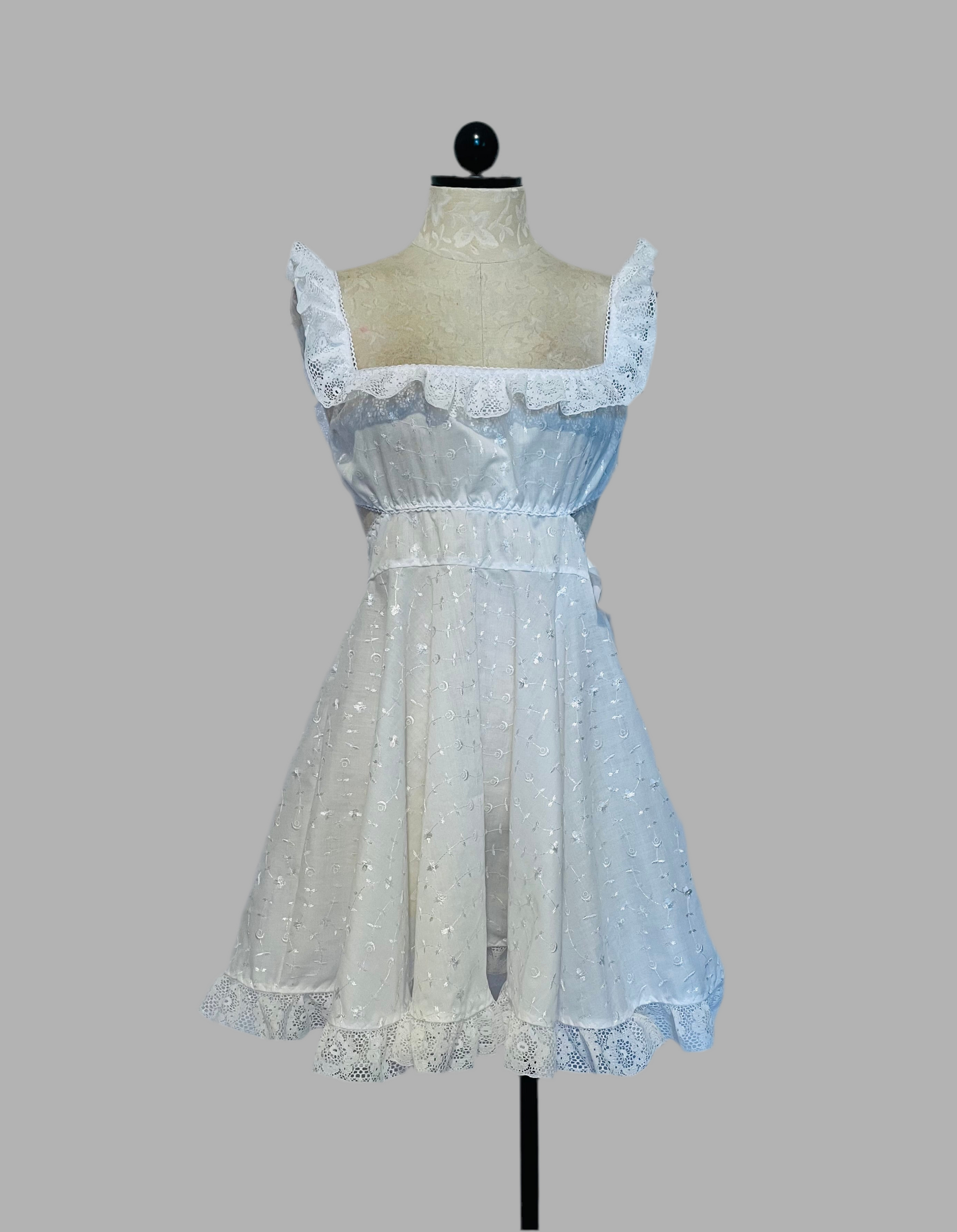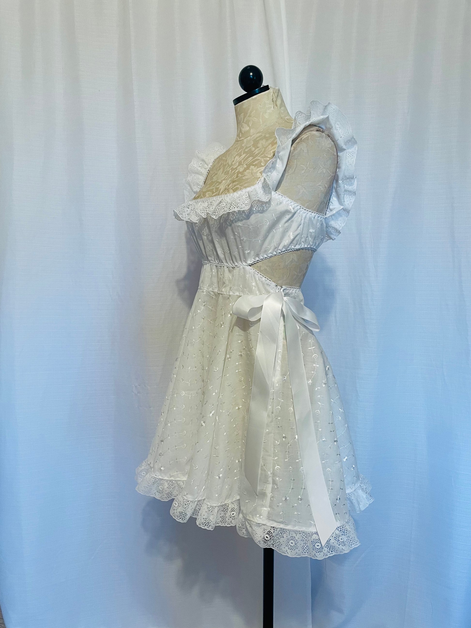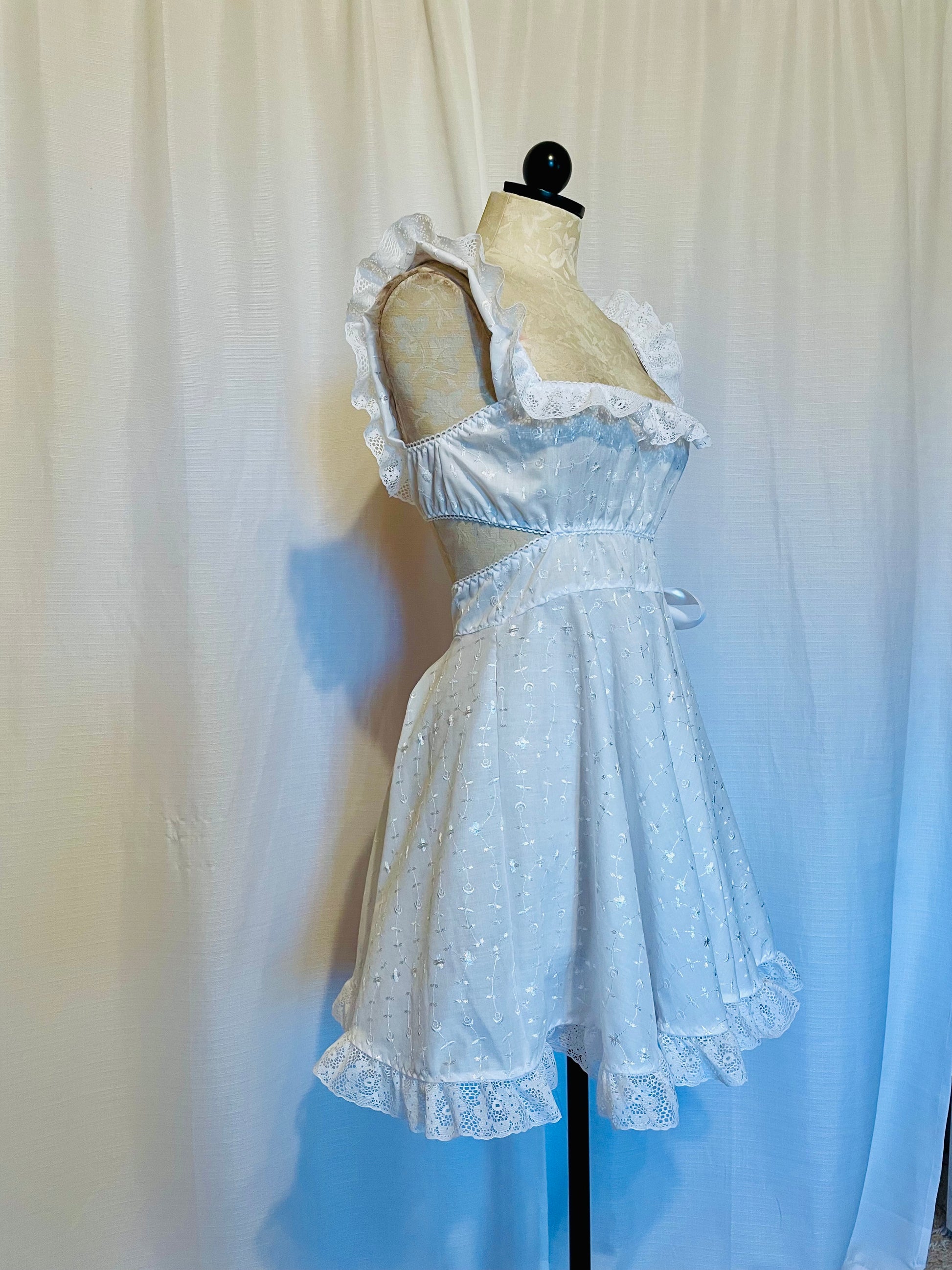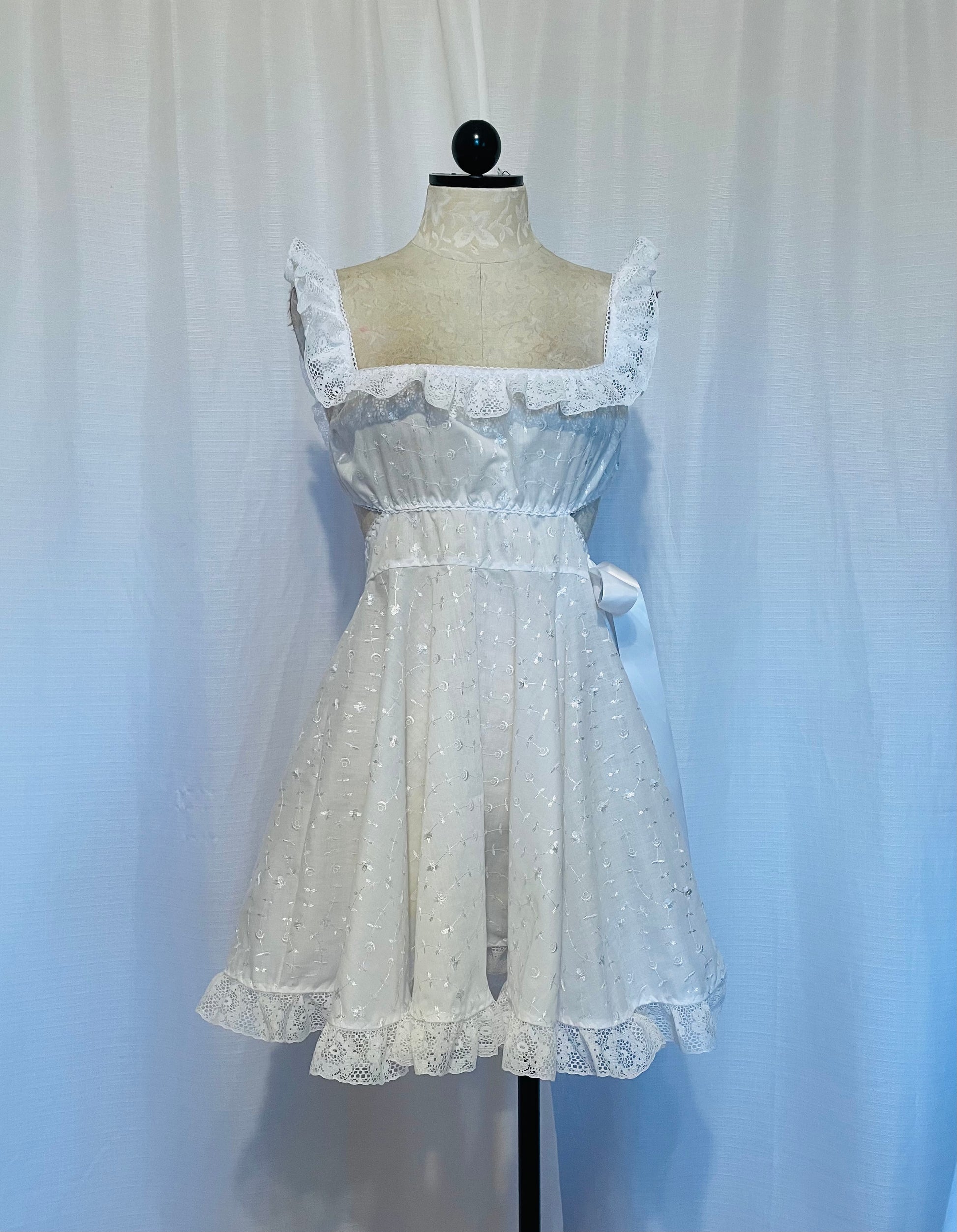 Cotton eyelet babydoll dress with French lace trim and side bow