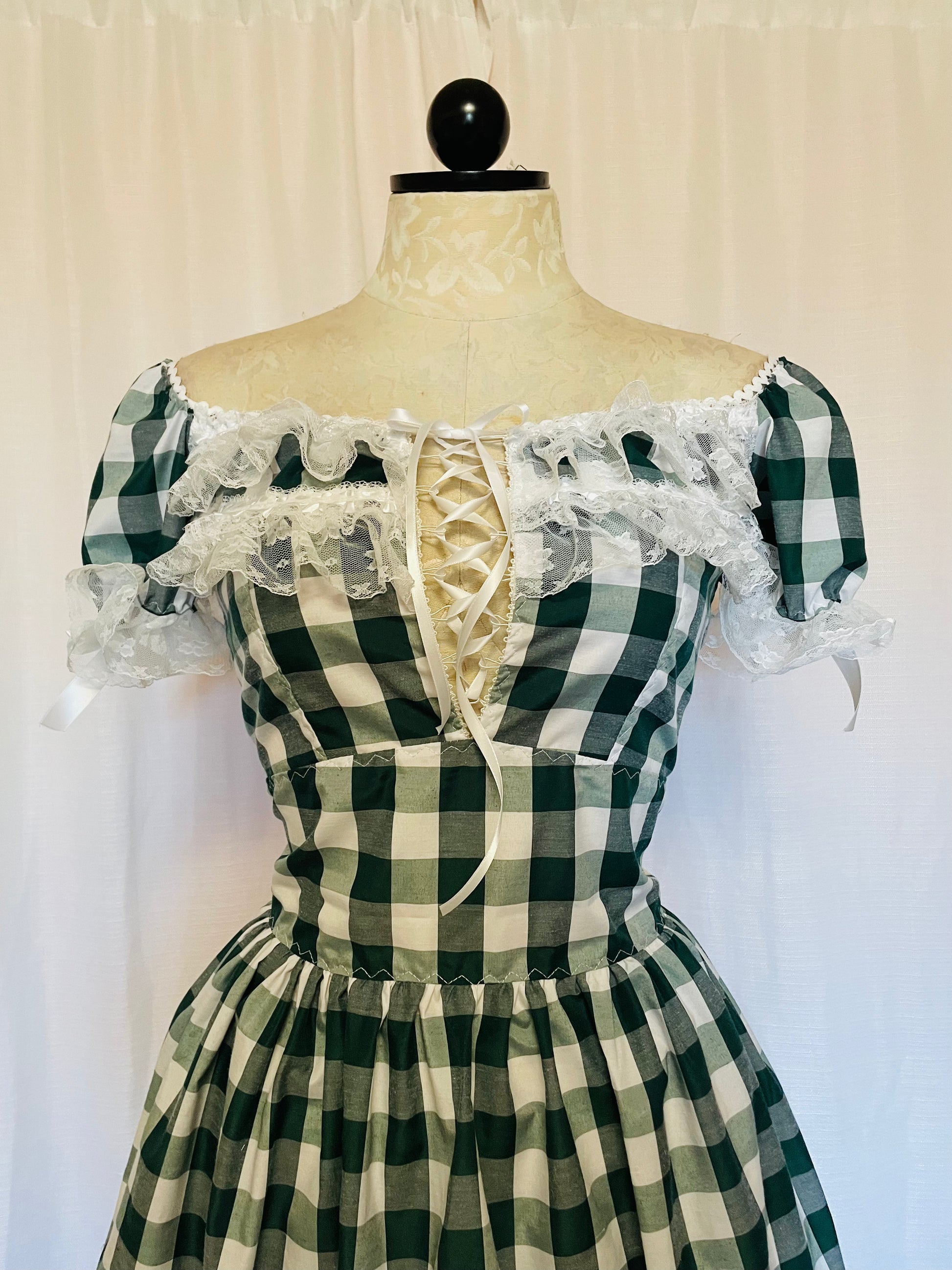Victorian gingham cotton dress with ruffled lace and ribbon detailing.