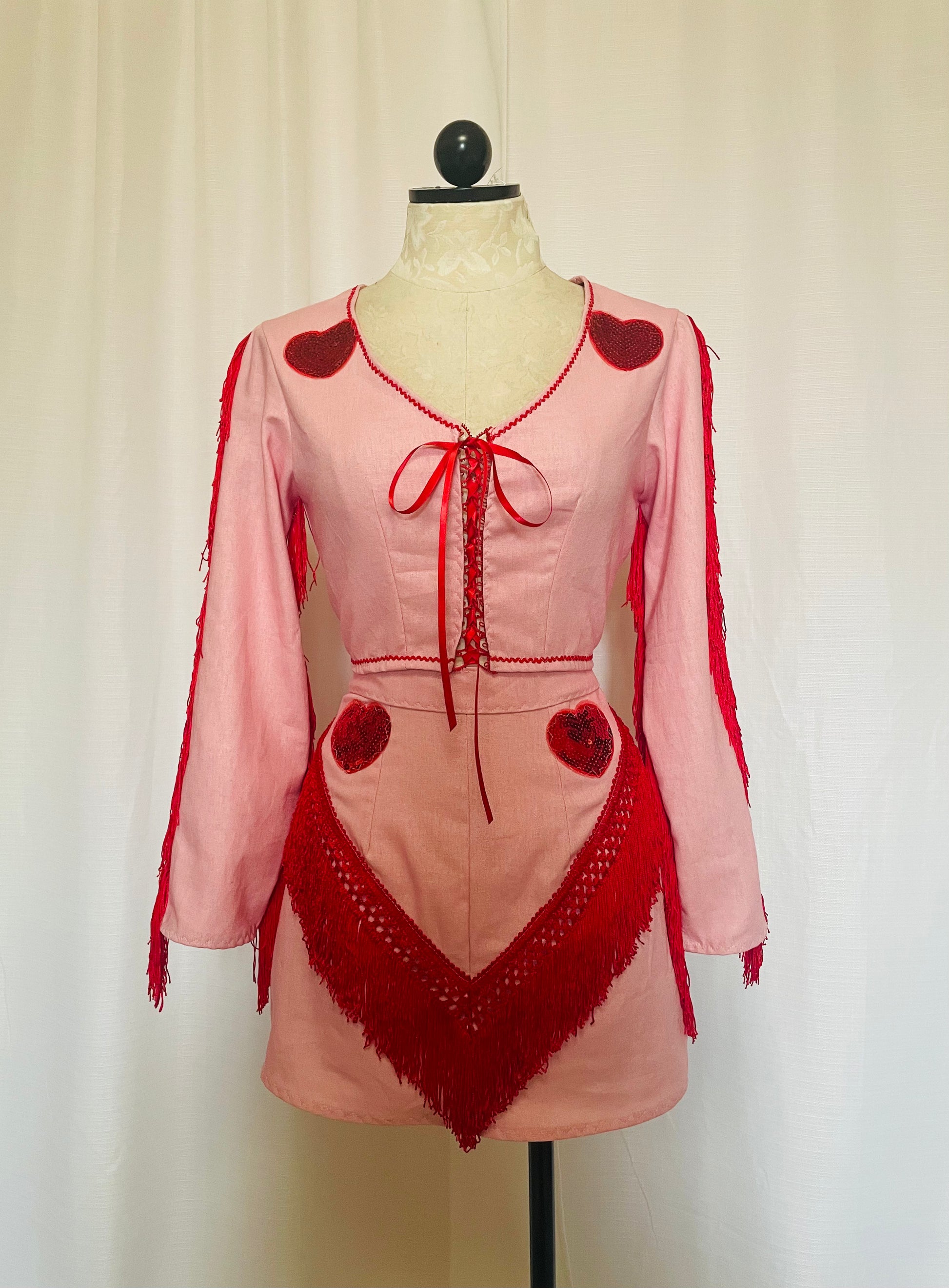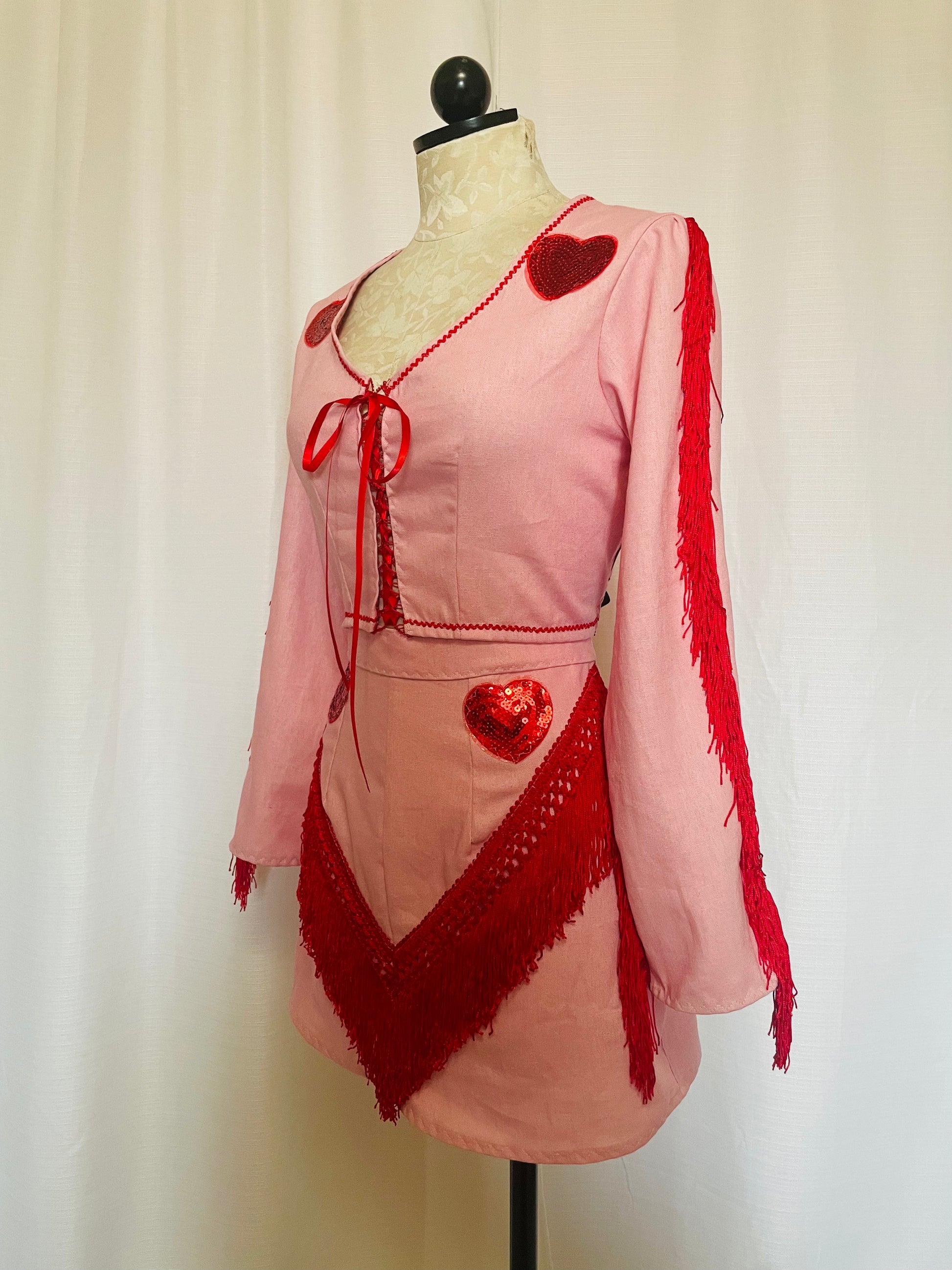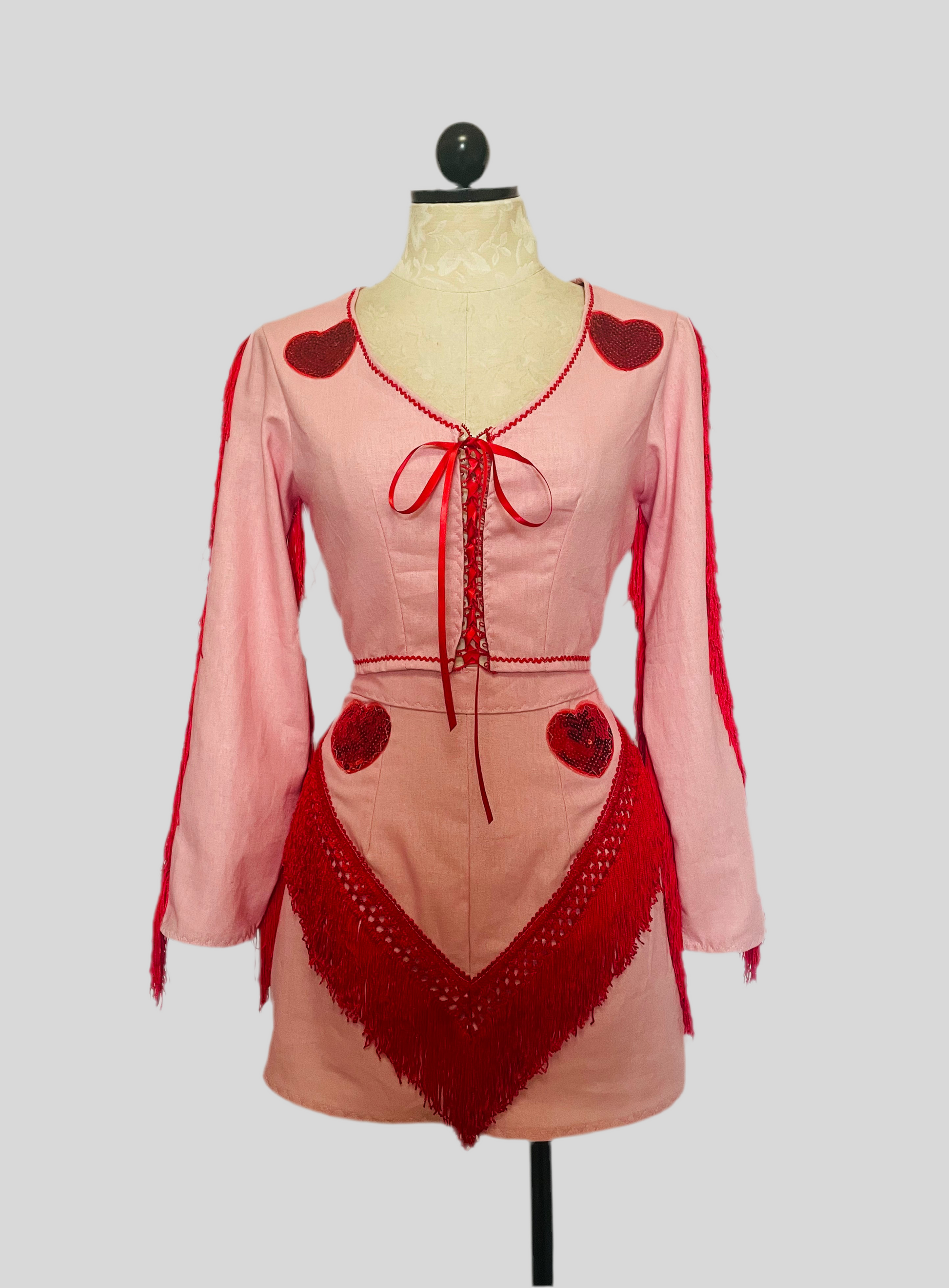 Country and western vintage style linen crop top with matching mini skirt. Fringe detailing with sequin hearts.
