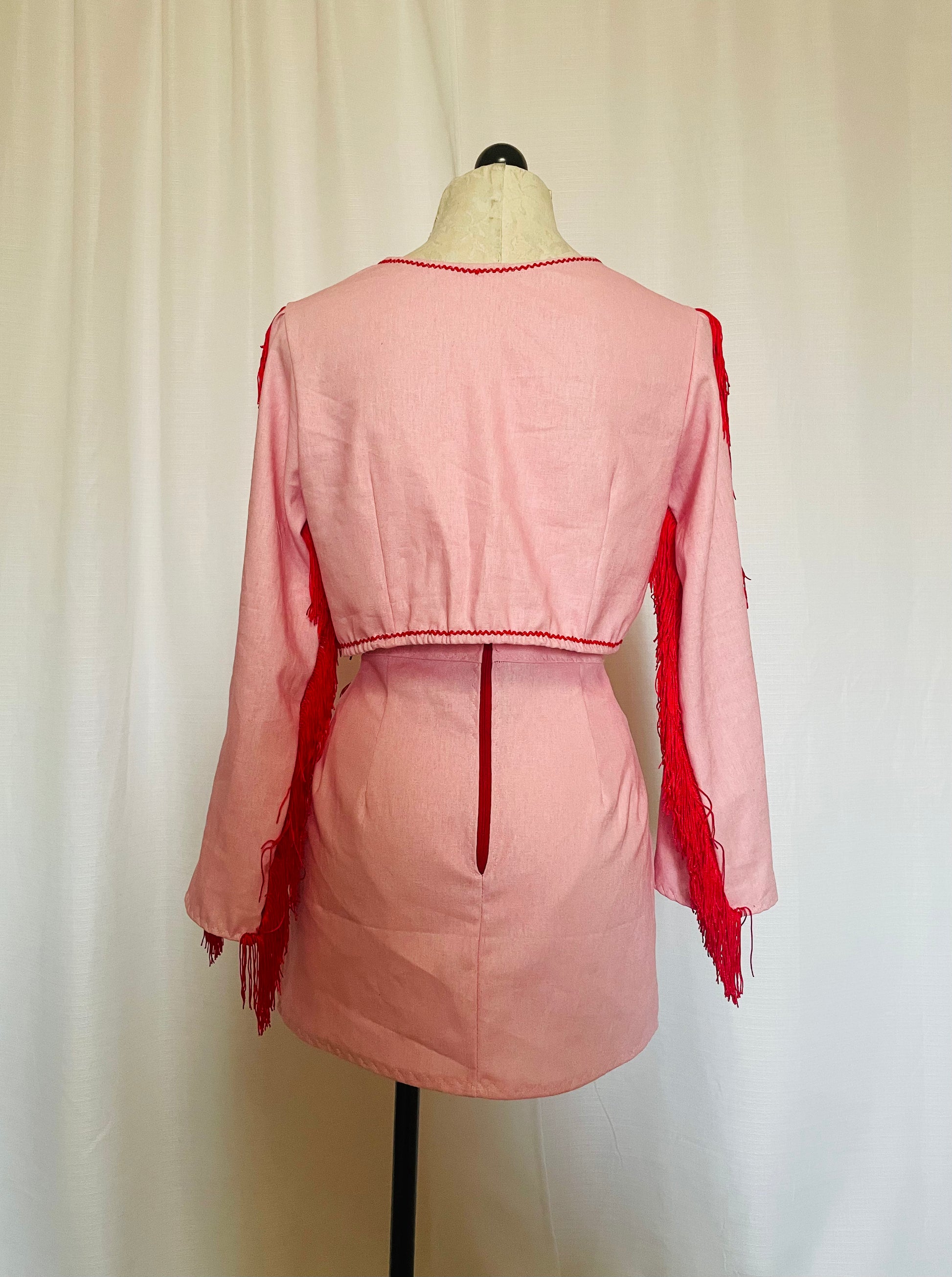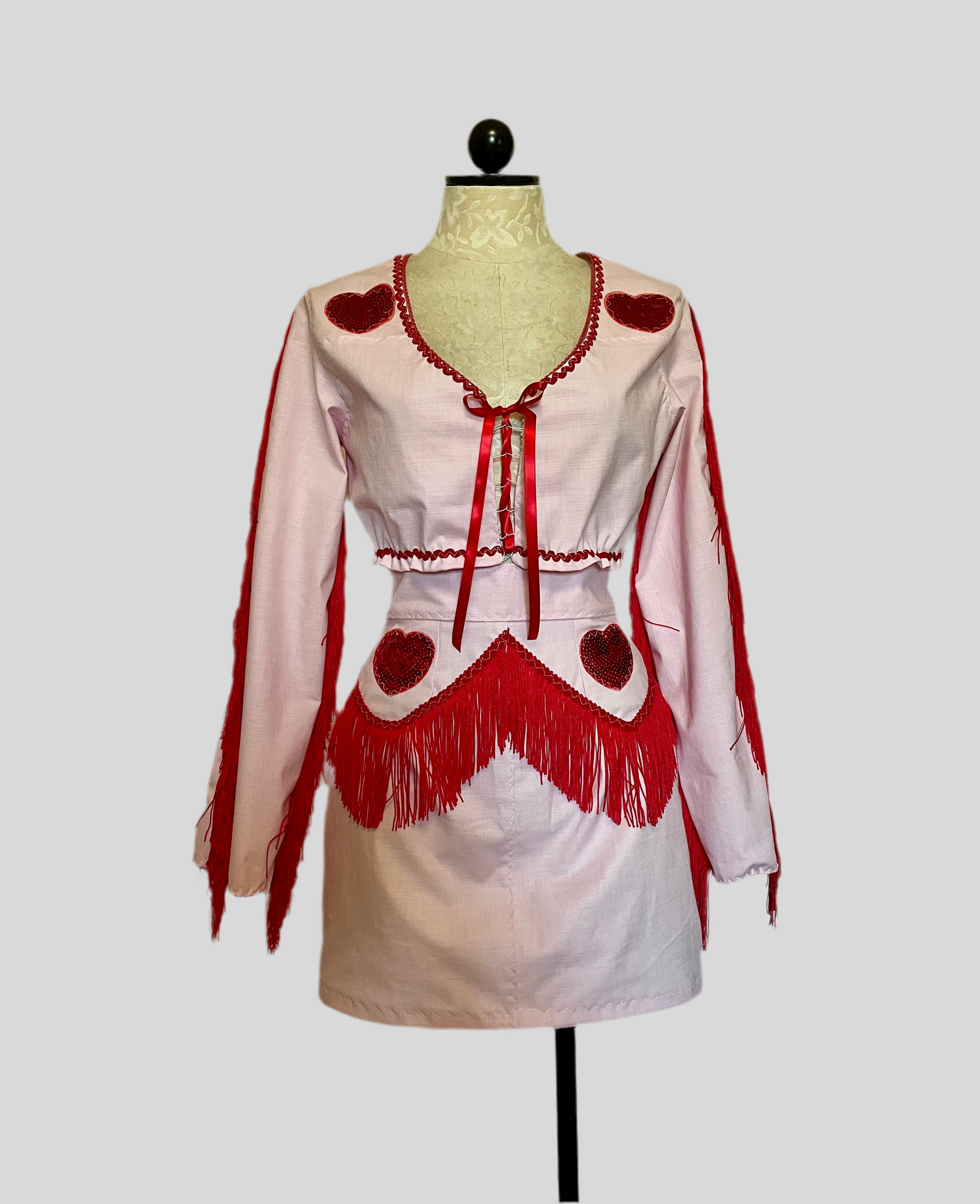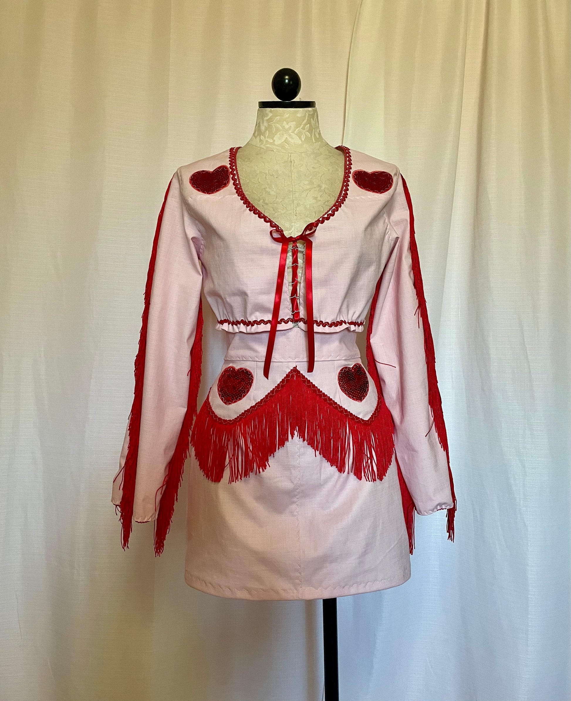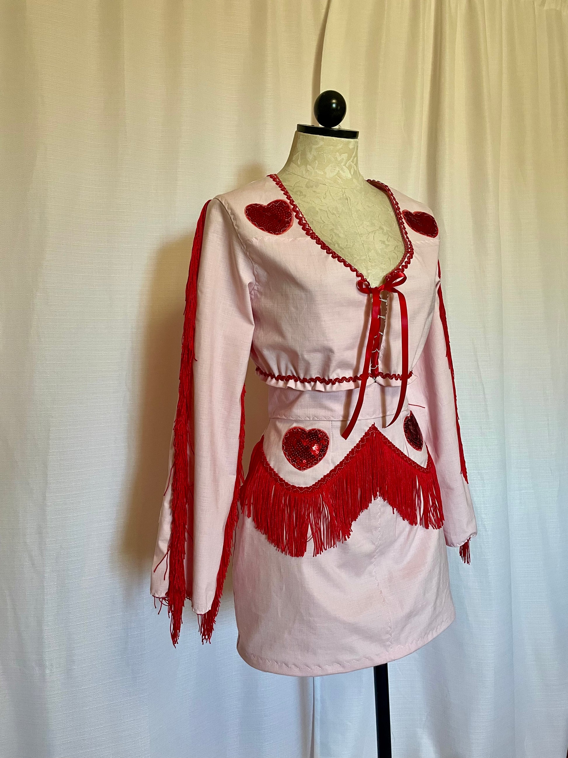 Country and western vintage style linen crop top with matching mini skirt. Fringe detailing with sequin hearts.