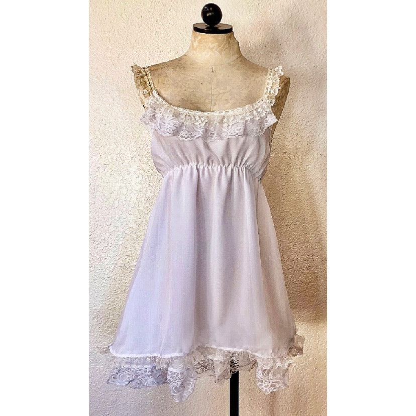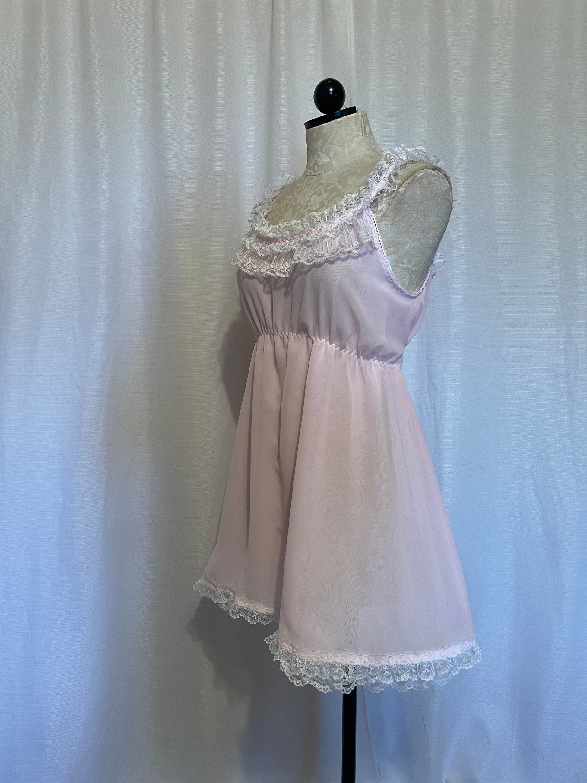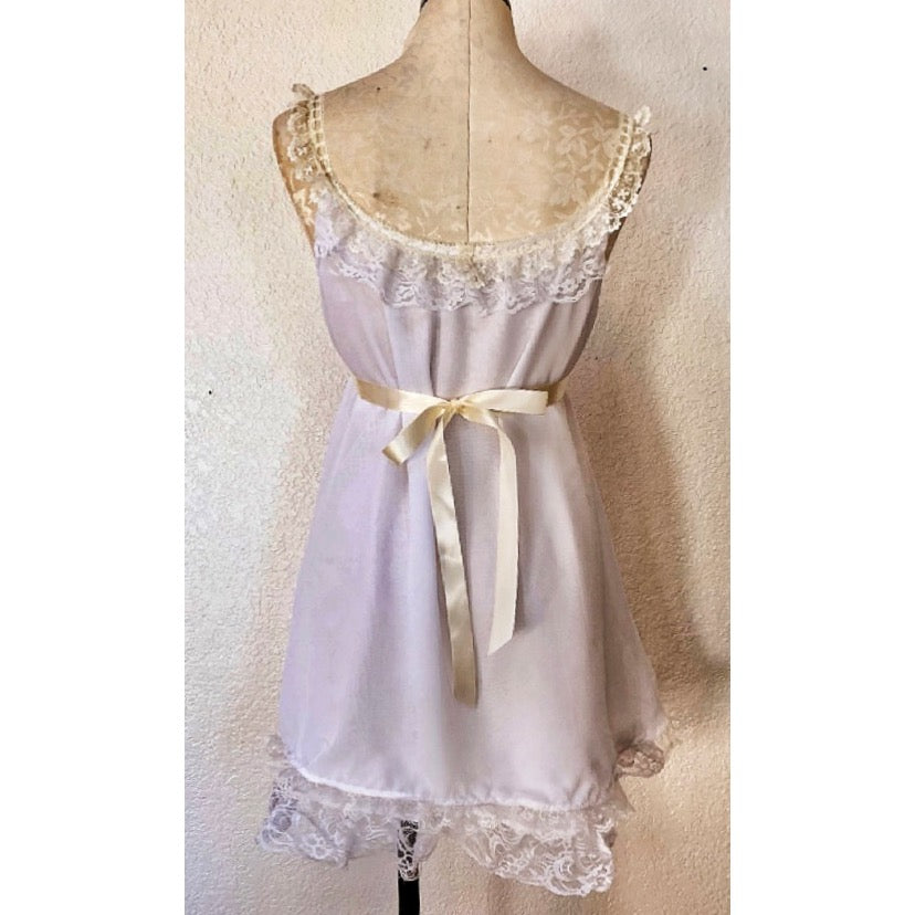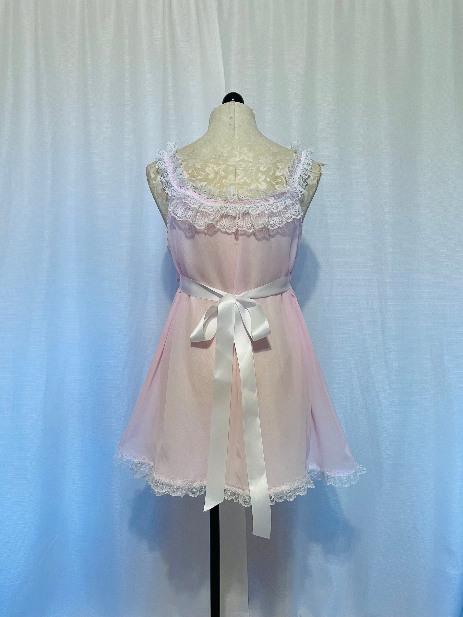 Vintage style chiffon nighty with ruffled trim and side ribbon ties.