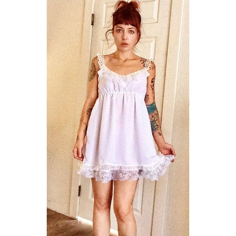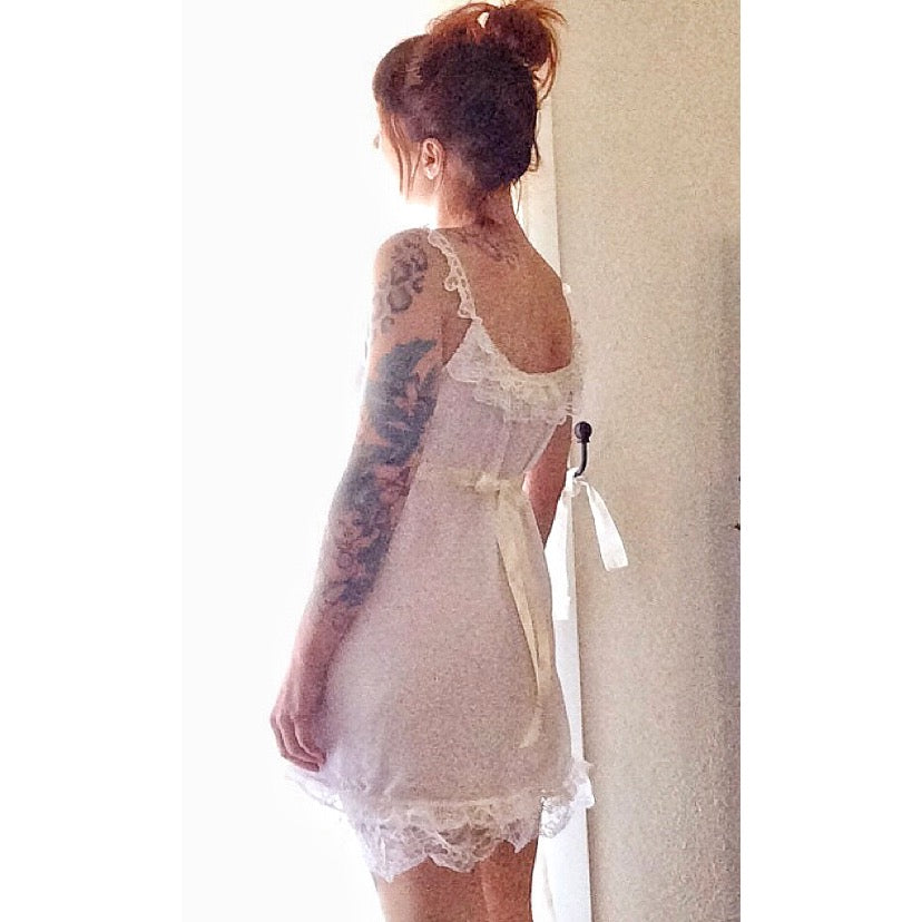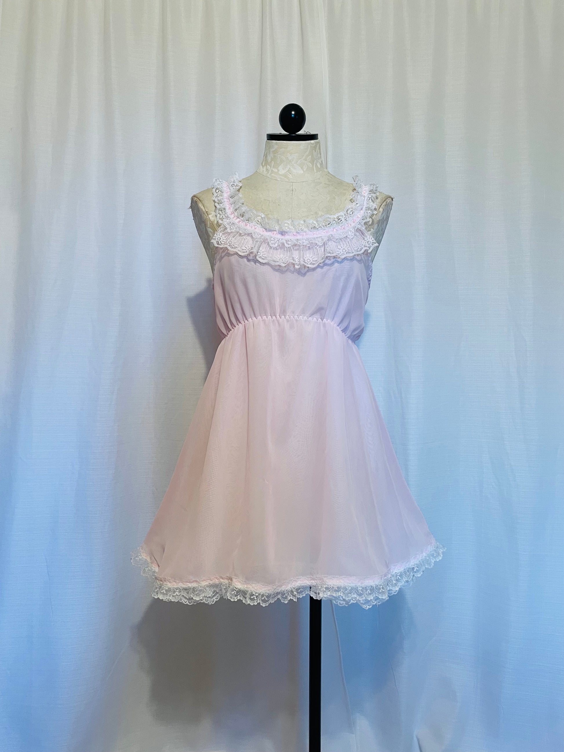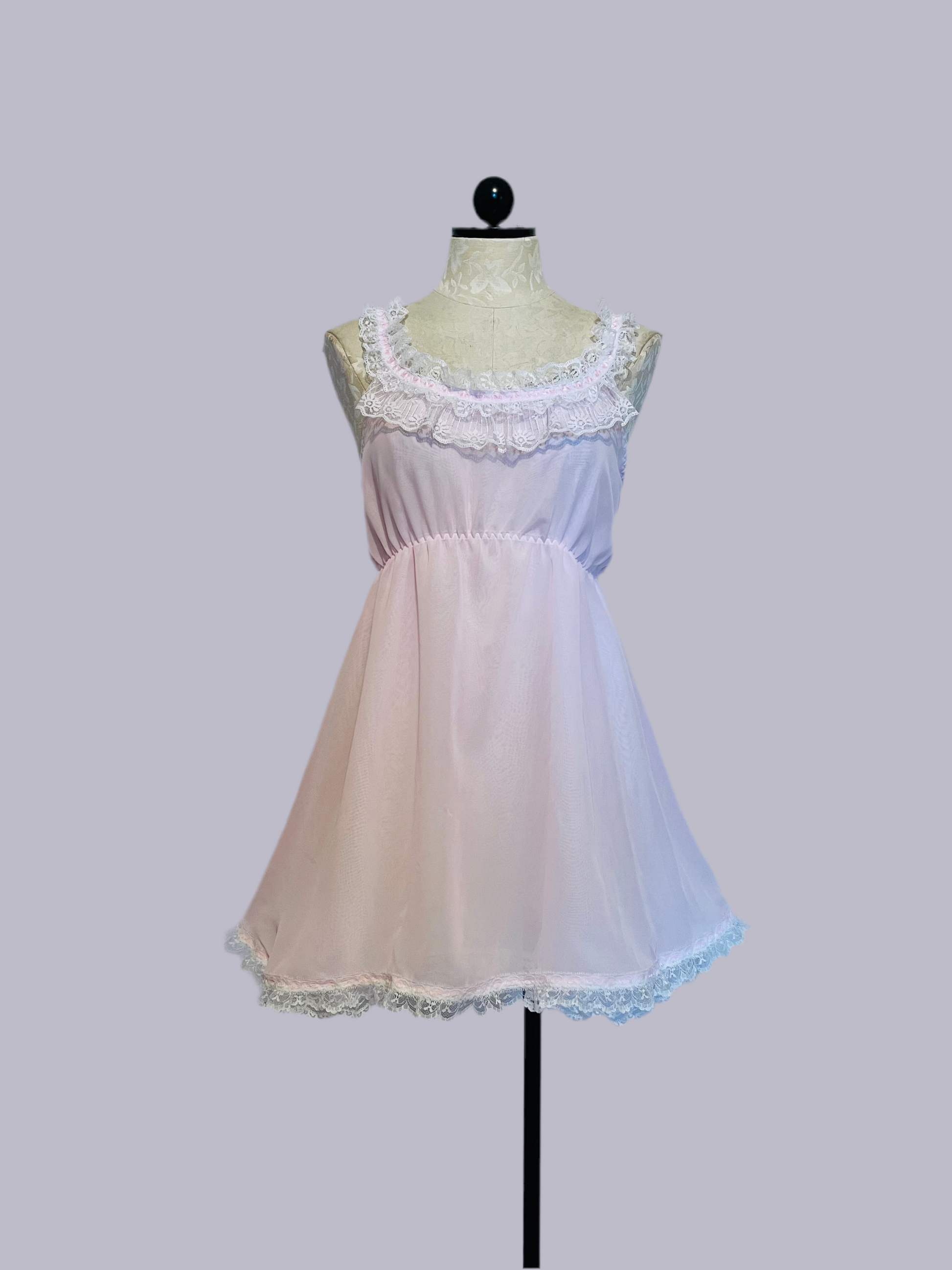 Vintage style chiffon nighty with ruffled trim and side ribbon ties.