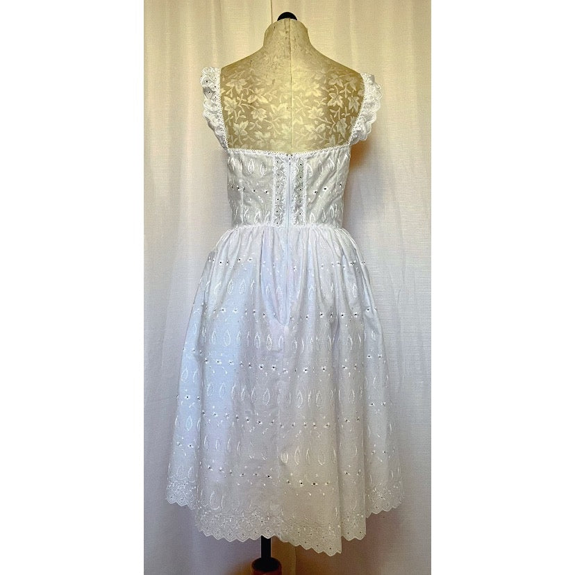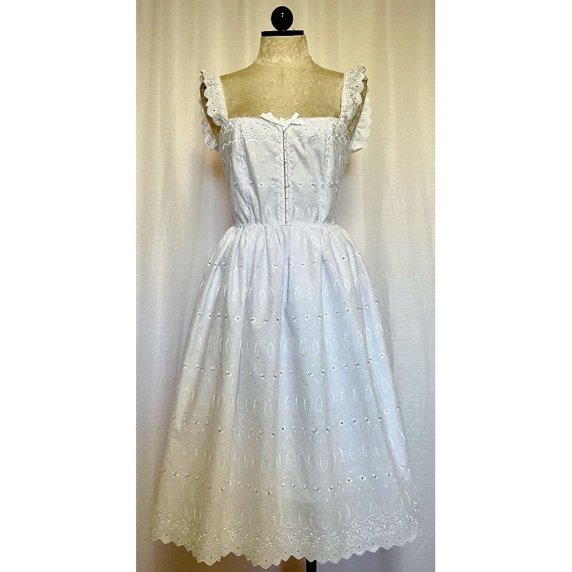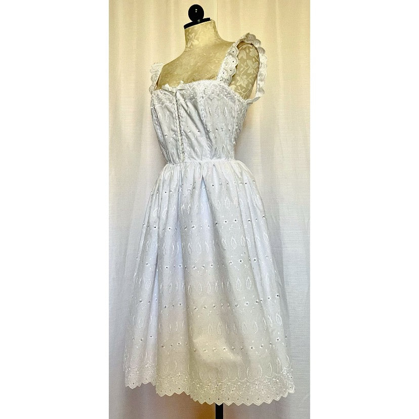 Beautiful cotton eyelet midi dress with ruffled shoulder straps, hook and eye closure at bodice, and Eyelet lace trim