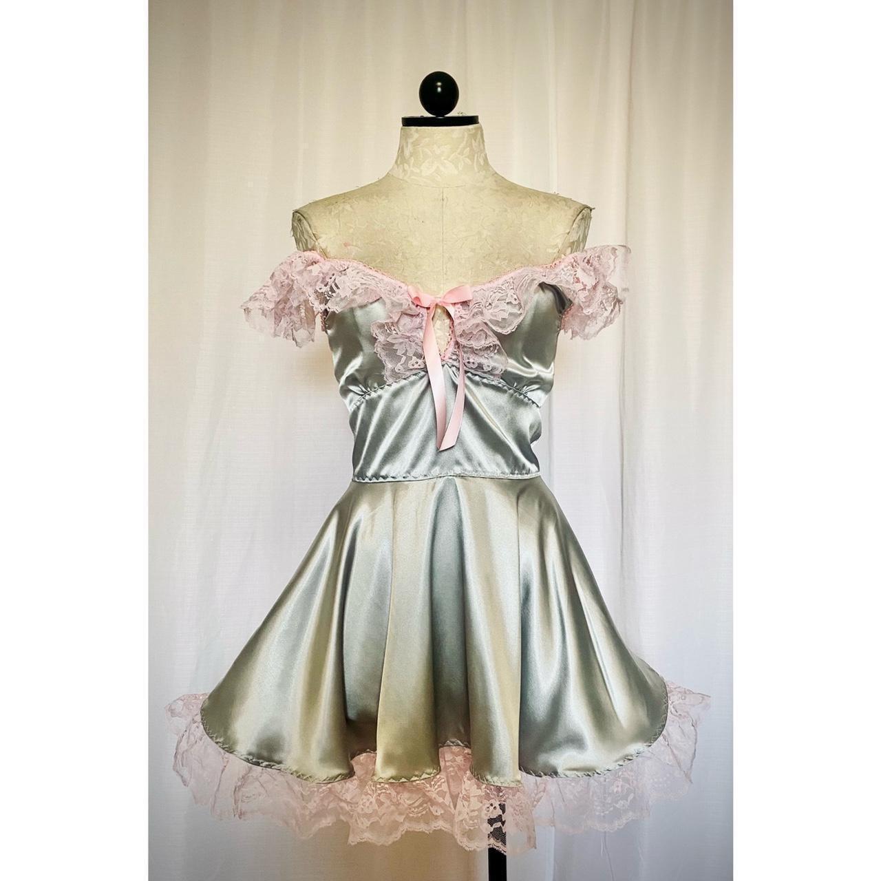 Stretch satin with lace trim and ribbon detailing. She can be worn both on or off the shoulders