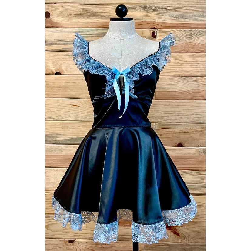 Stretch satin with lace trim and ribbon detailing. She can be worn both on or off the shoulders