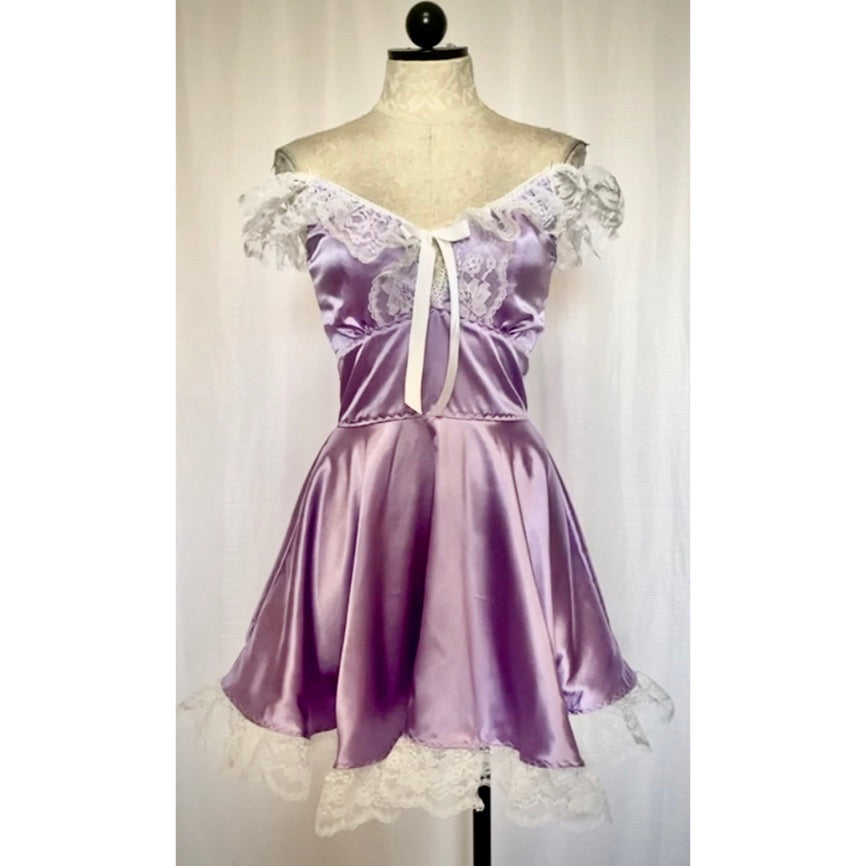 Stretch satin with lace trim and ribbon detailing. She can be worn both on or off the shoulders