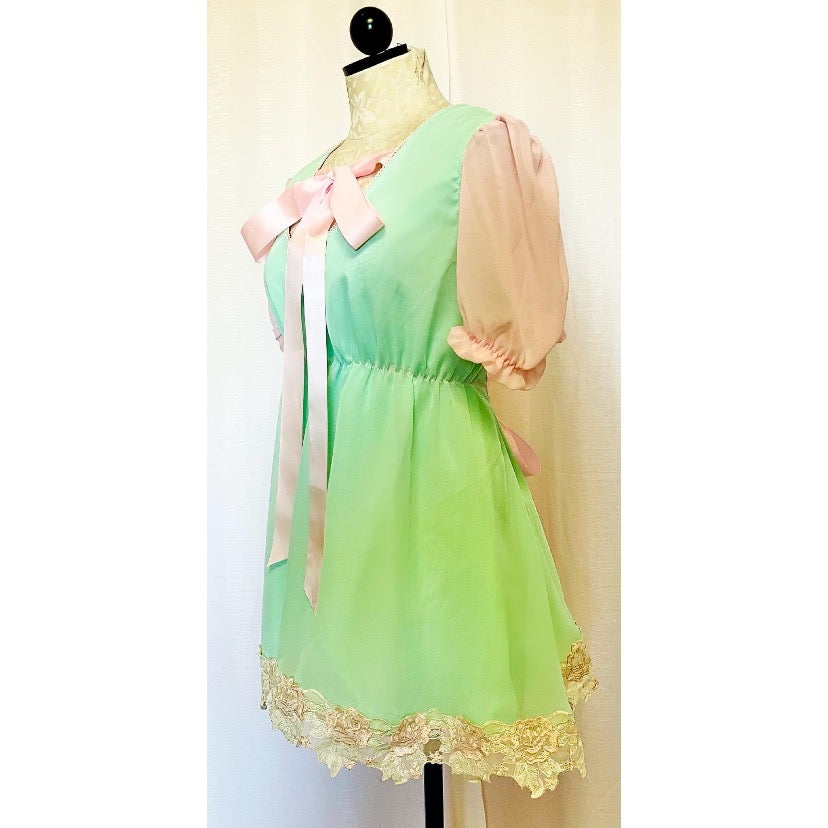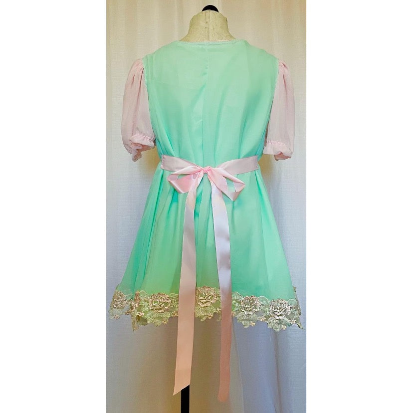 Chiffon over cotton with rose embroidered vintage lace and ribbon bow details