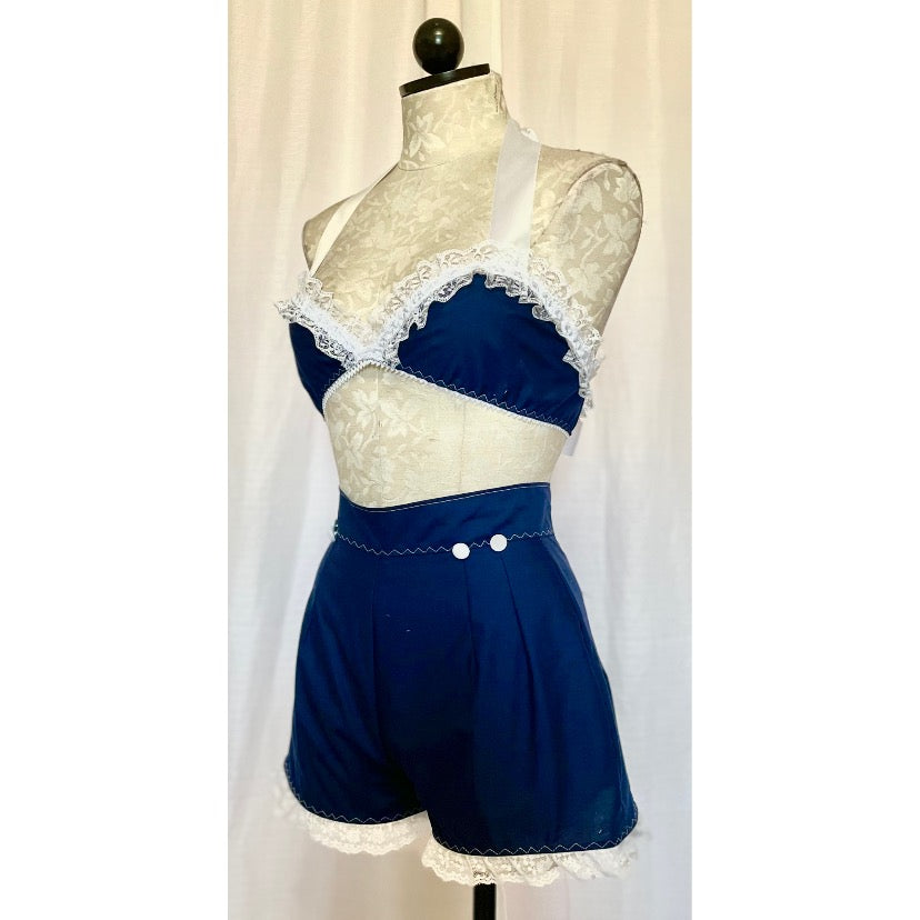 Cotton halter bra with ribbon ties and ruffled lace detailing and matching fitted high waisted shorts