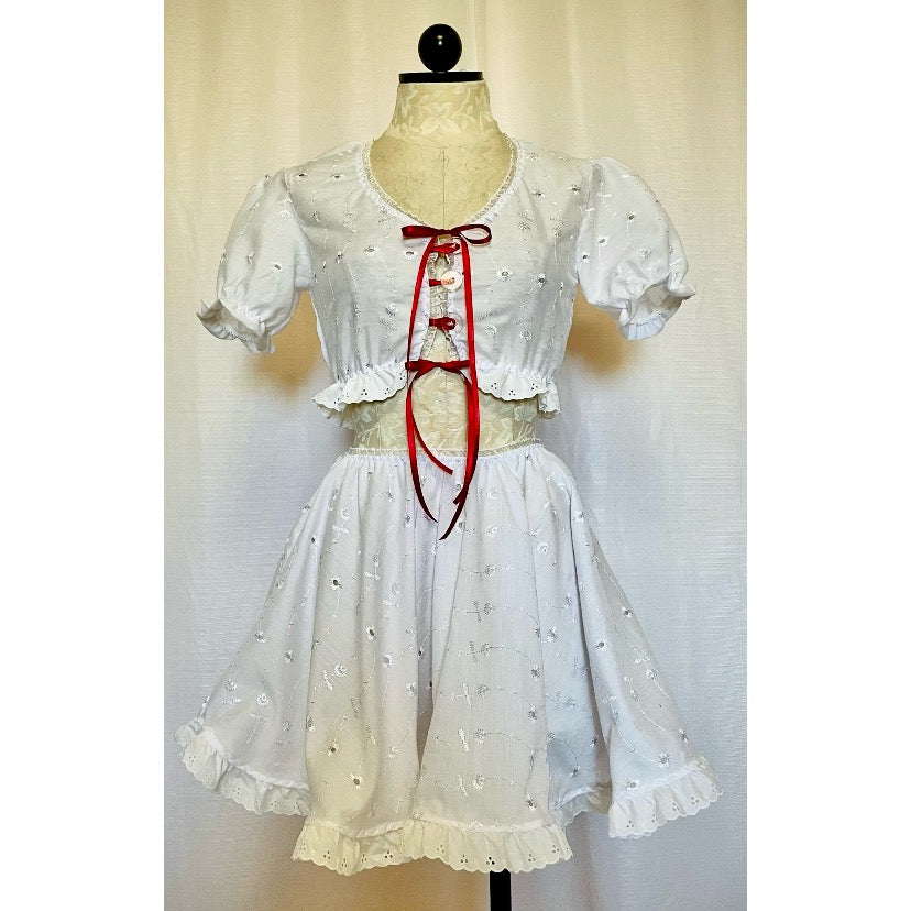 Vintage style eyelet cotton crop top with matching circle skirt. Carefree and fun making her the perfect little number for an afternoon at the fair or an evening under neon carnival lights.