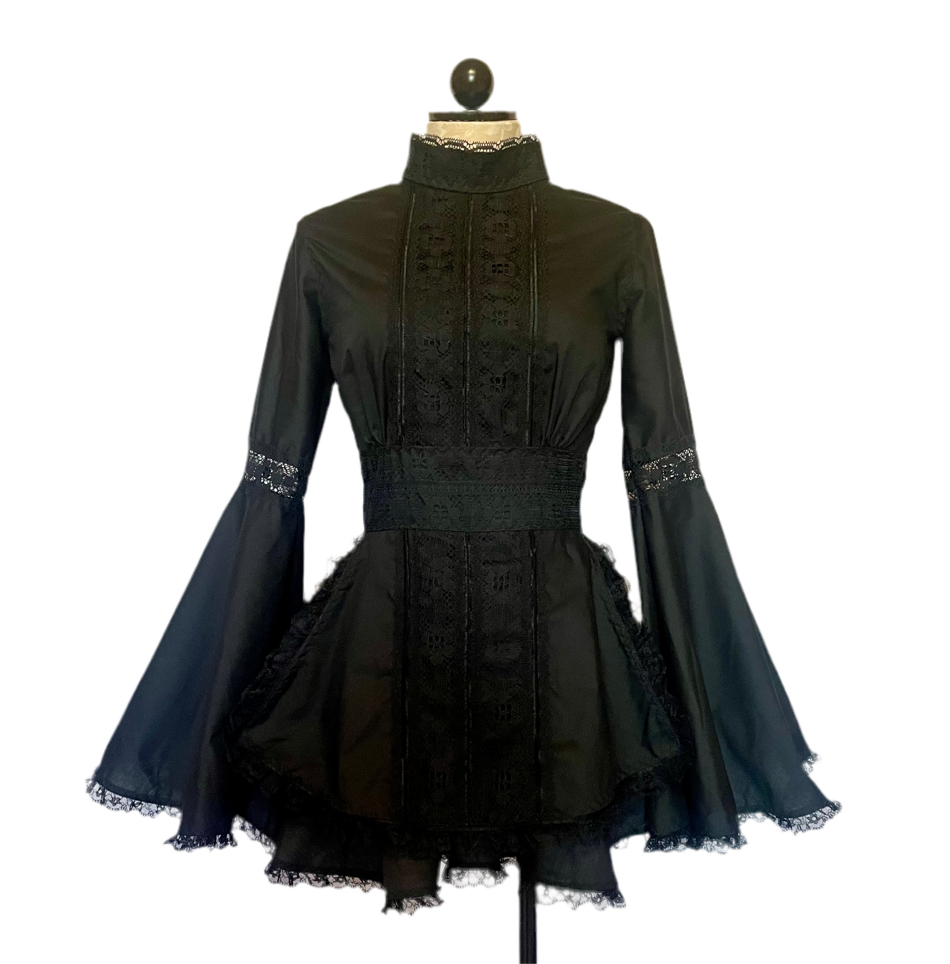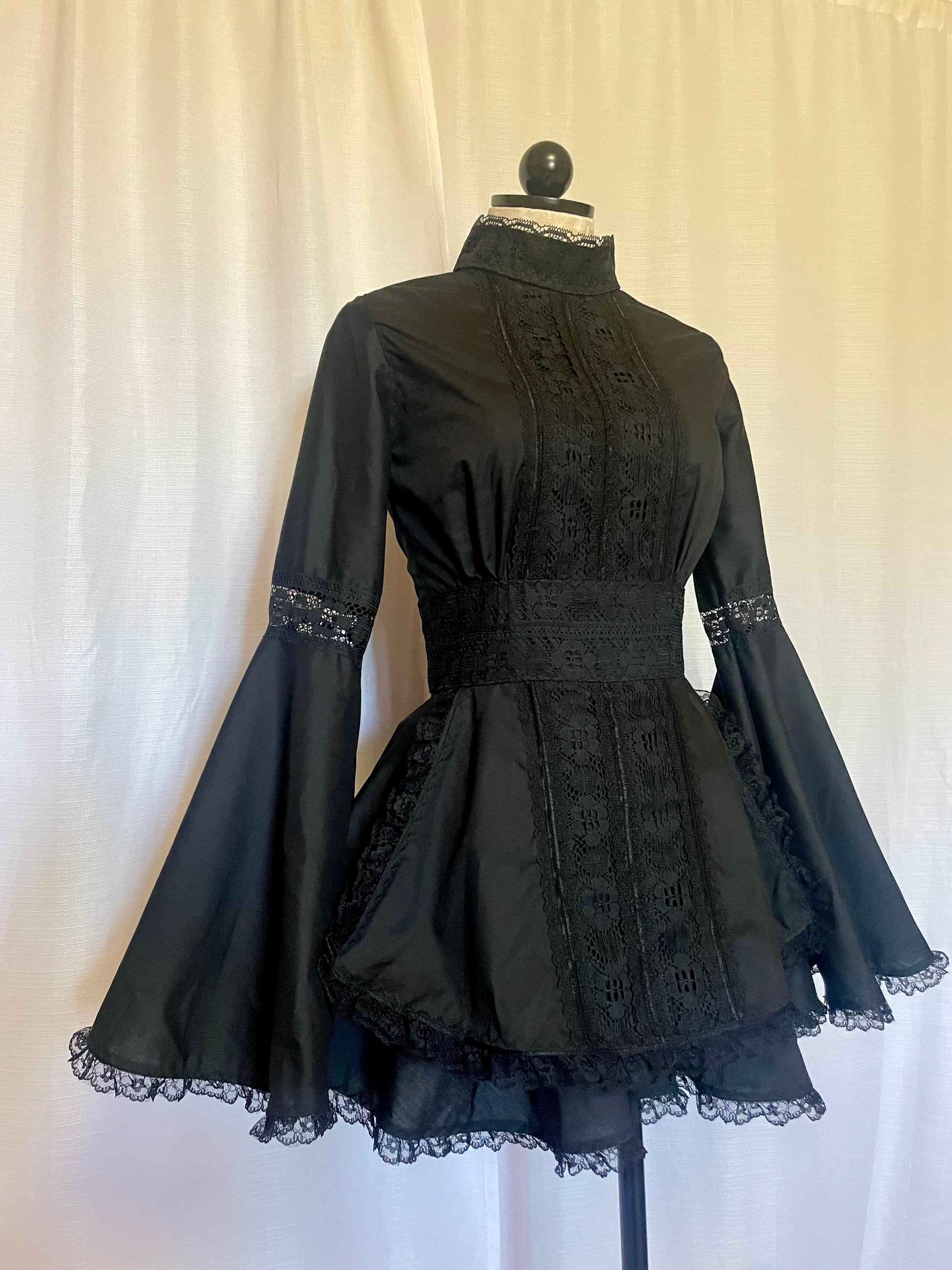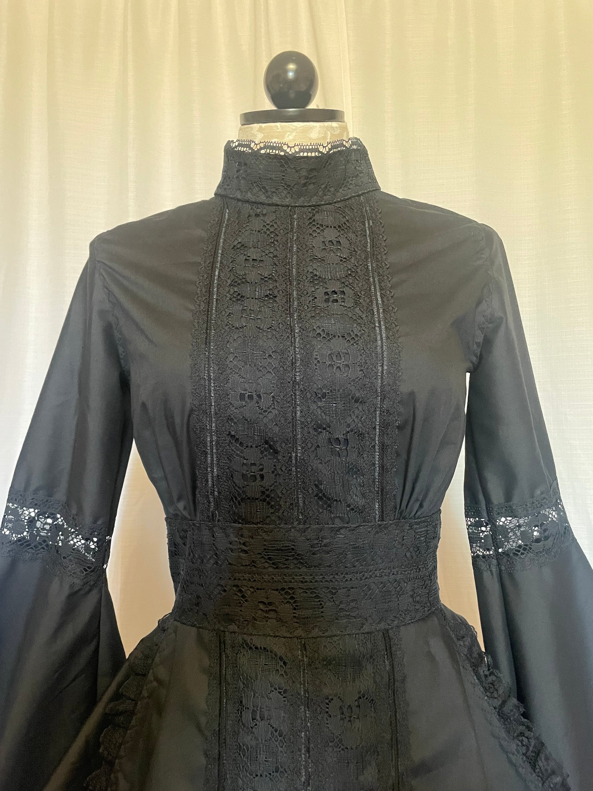 High collar Victorian style fitted dress made with cotton and lace detailing. Dramatic bell sleeve details