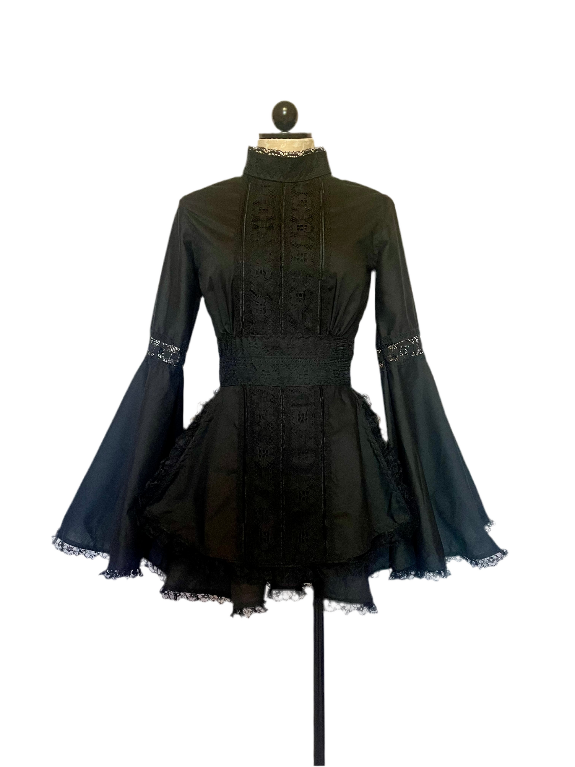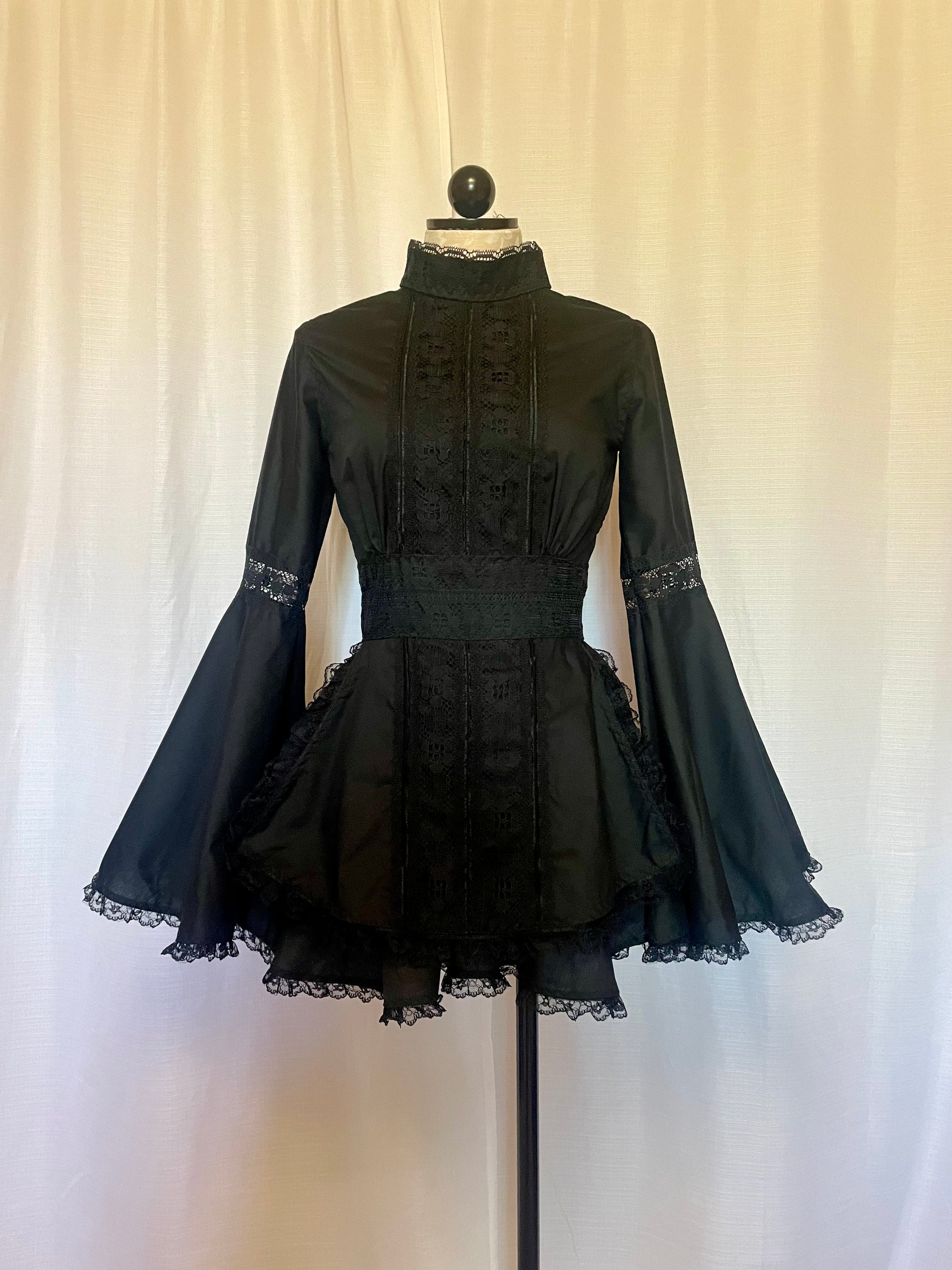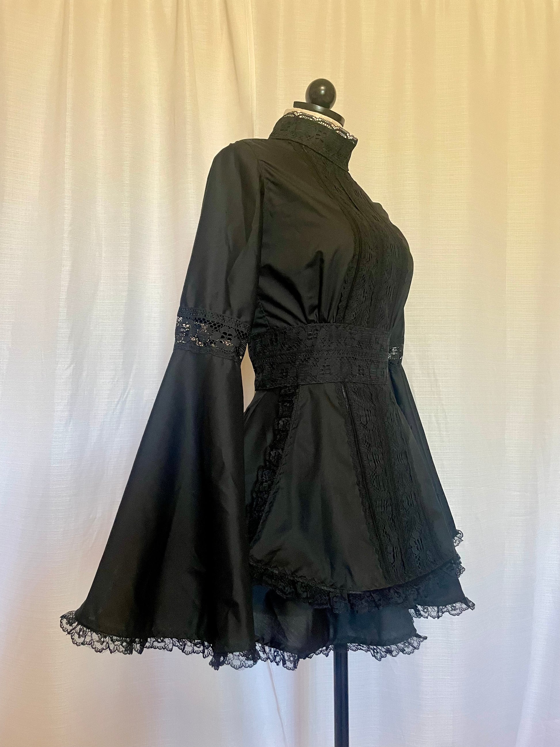 High collar Victorian style fitted dress made with cotton and lace detailing. Dramatic bell sleeve details