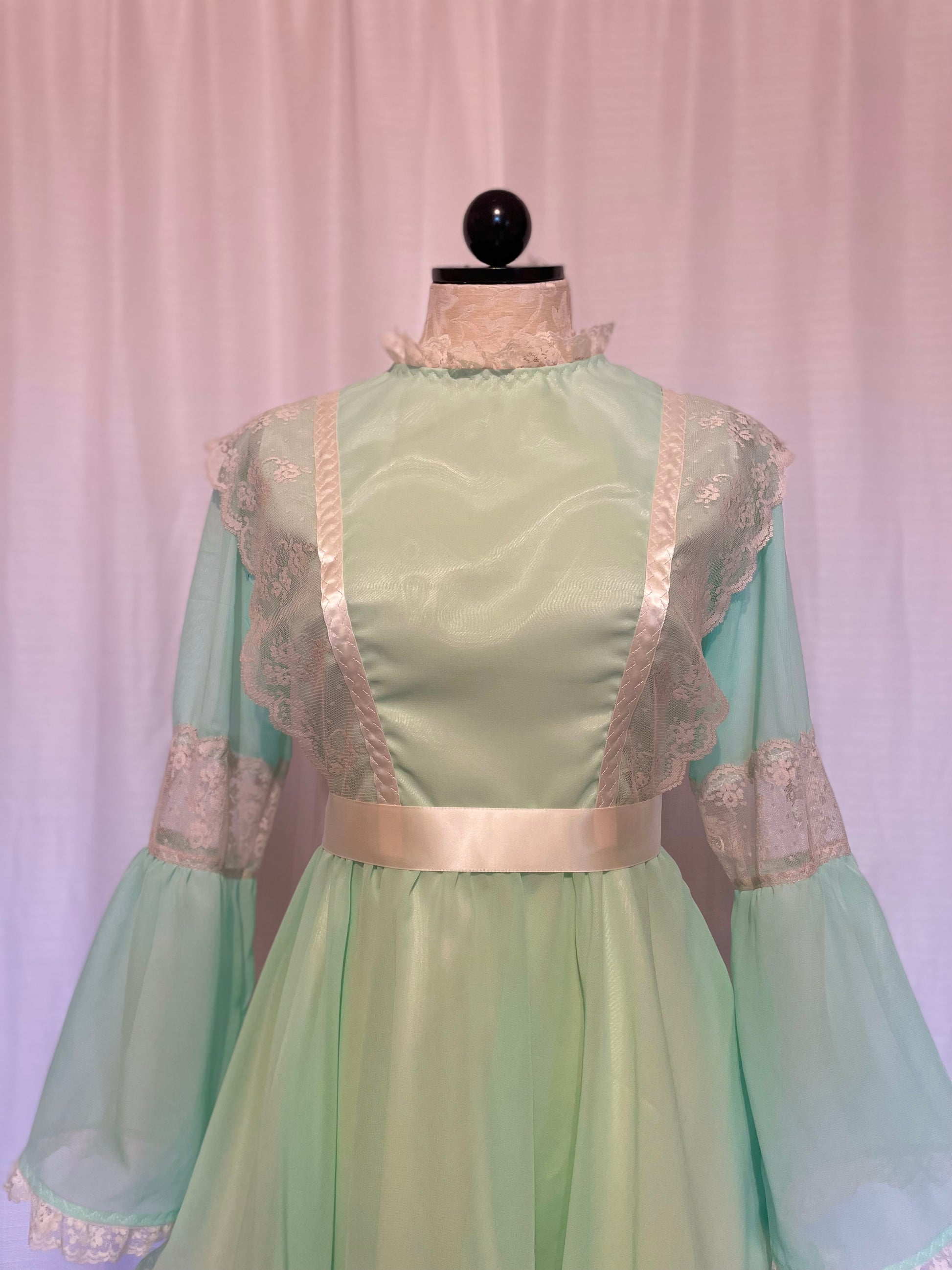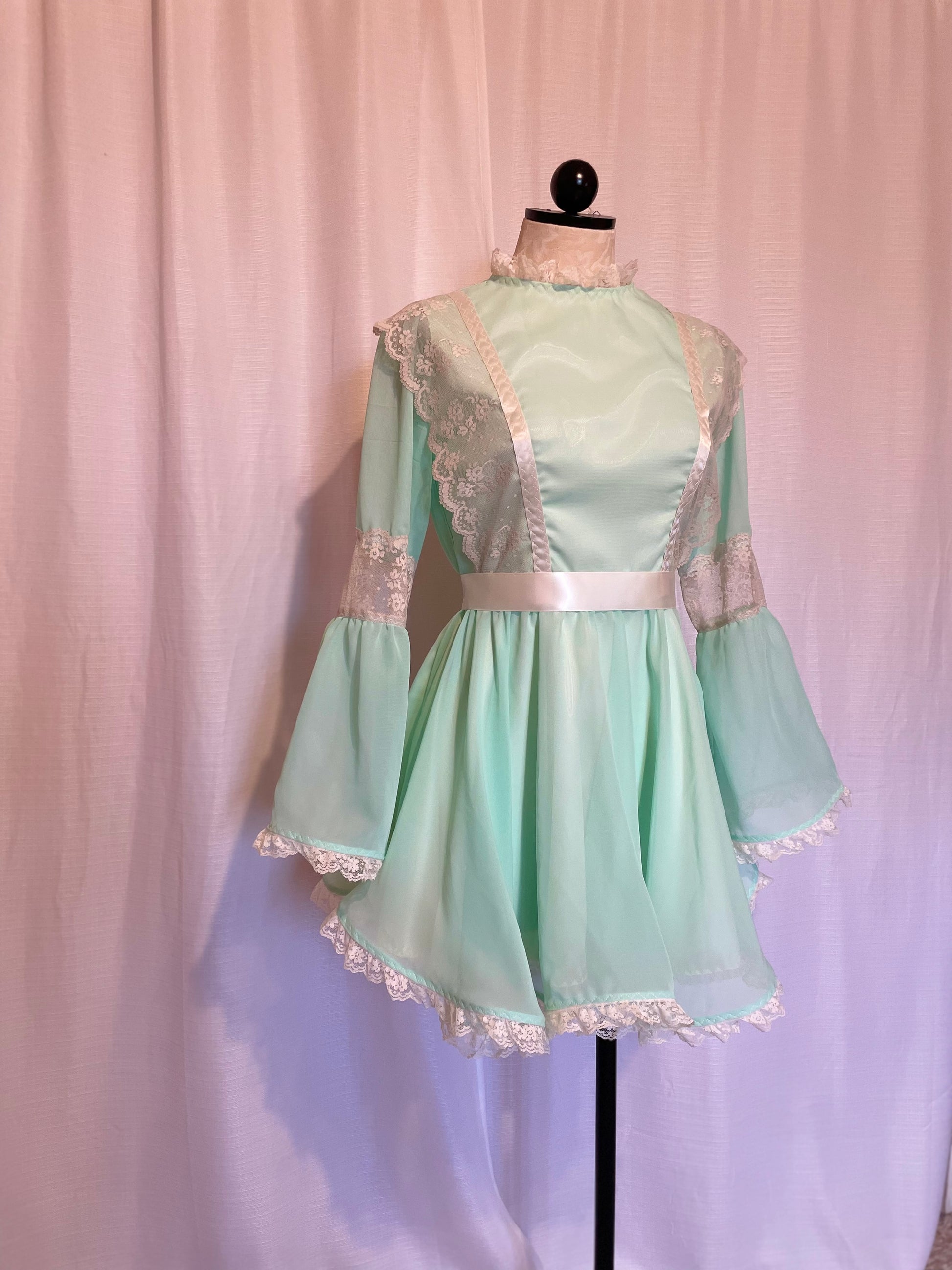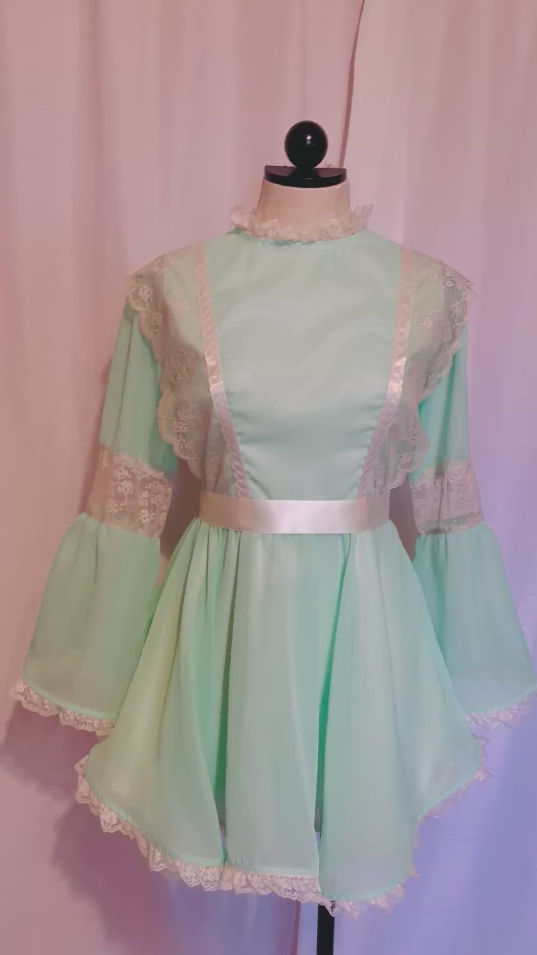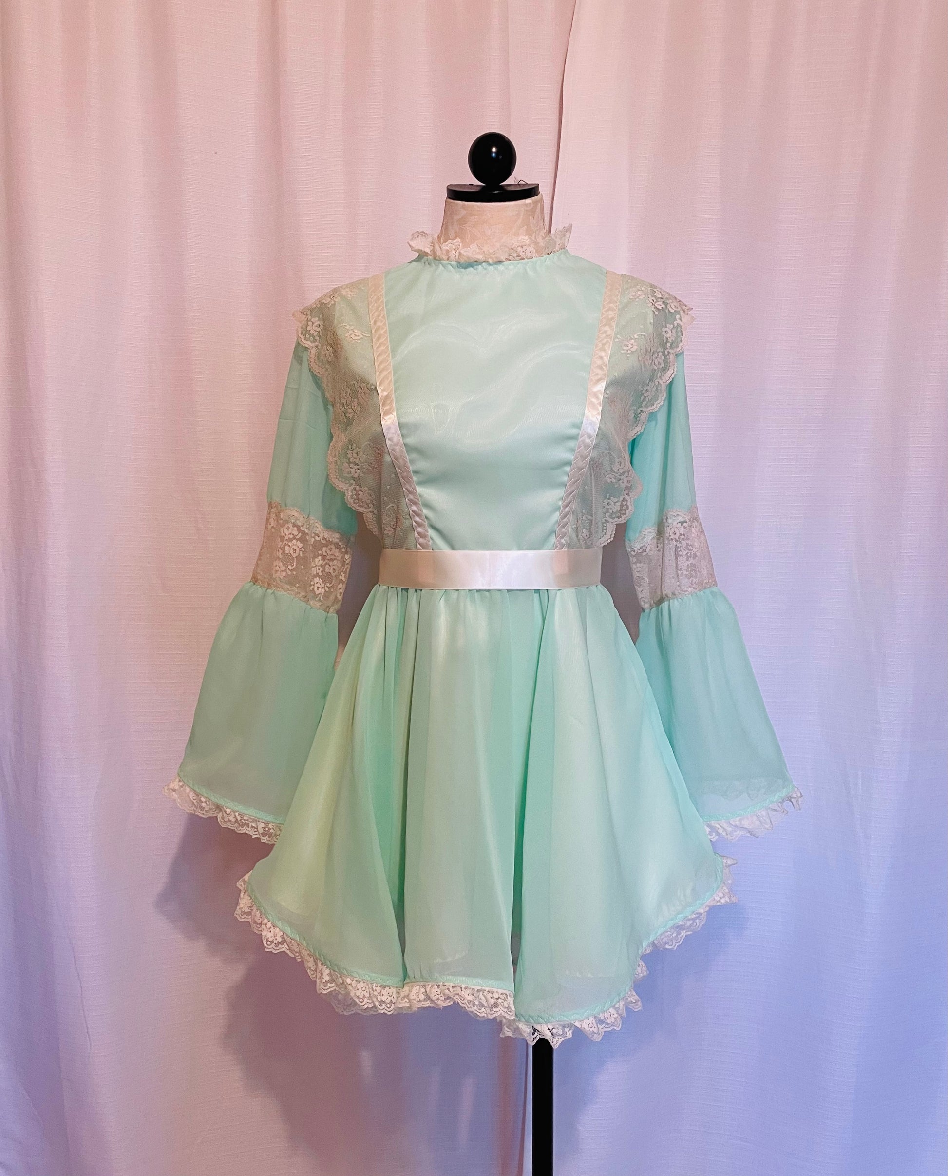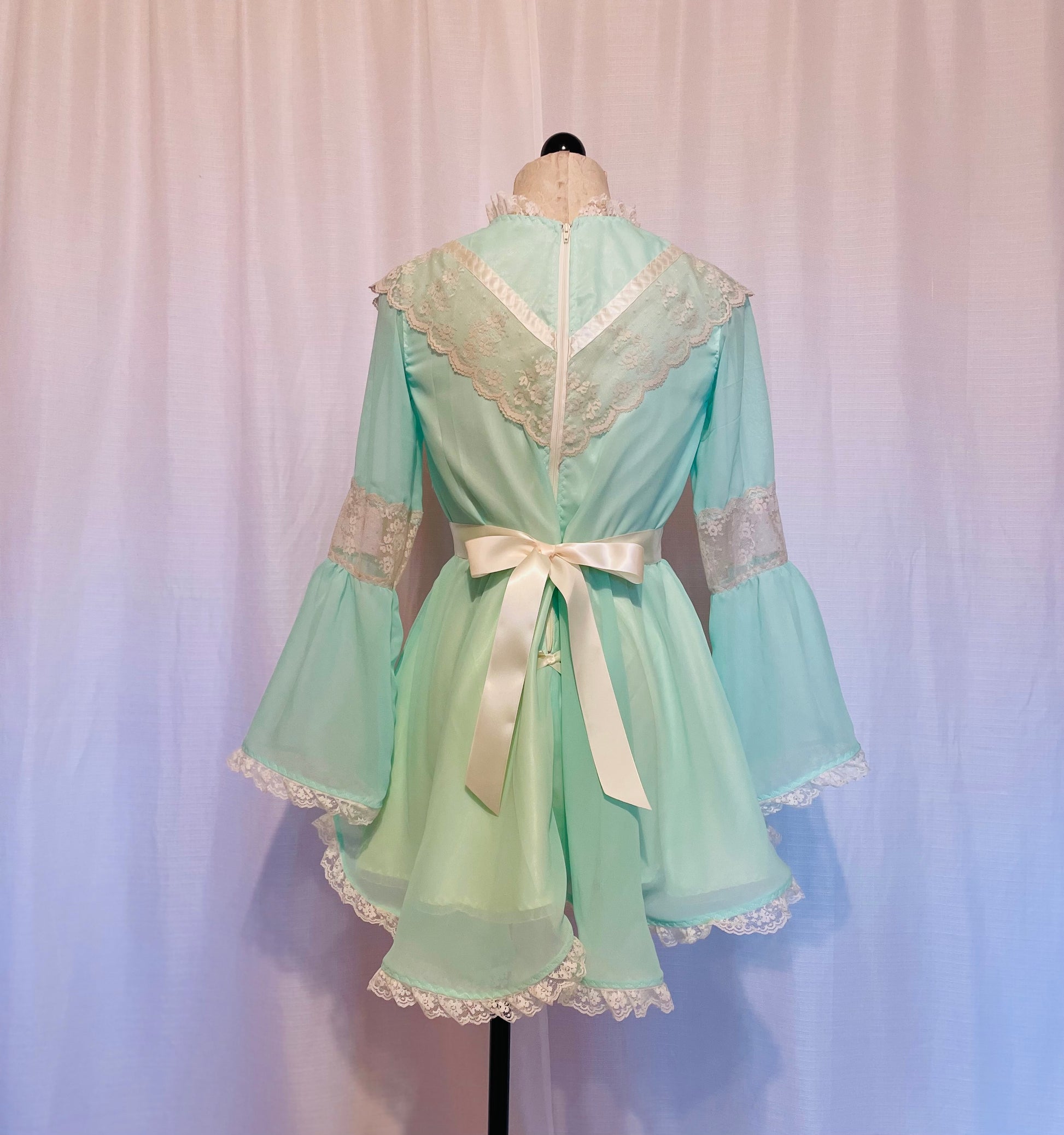 Chiffon over satin vintage inspired babydoll dress with lace detailing and satin waist tie bow