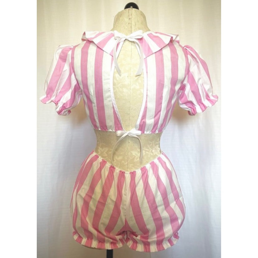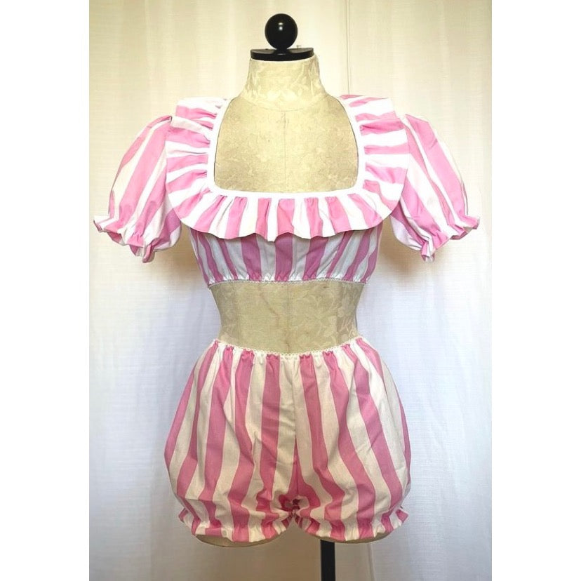 Cotton ruffled crop top with ribbon tie closures at neck and lower back. Matching high rise ruffled bloomer style shorts made with elastic waist band