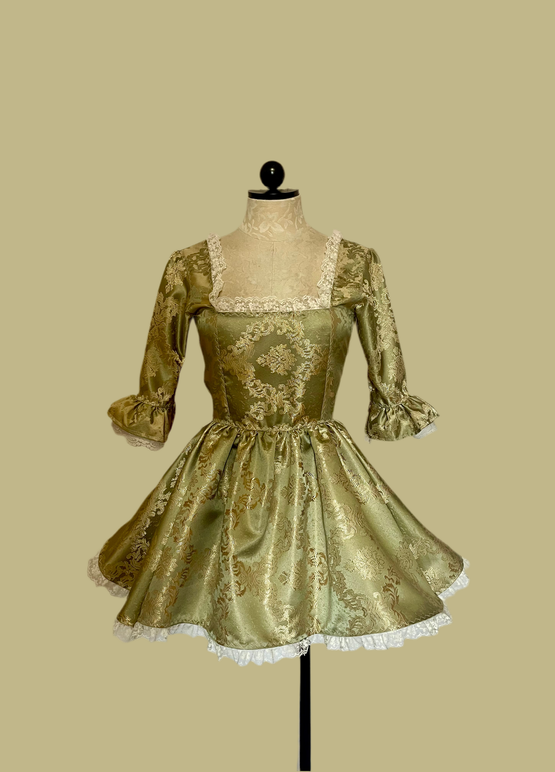 Victorian inspired damask satin dress with ruffled lace trim and back bow.