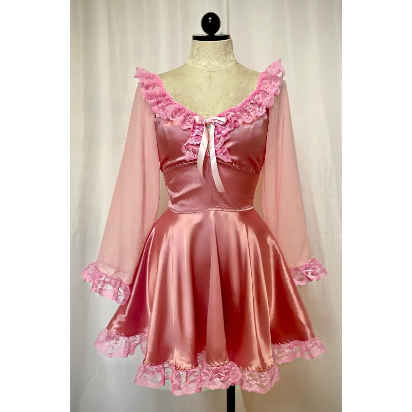 Vintage inspired off the shoulder dress in stretch satin with ruffled lace and chiffon sleeve.