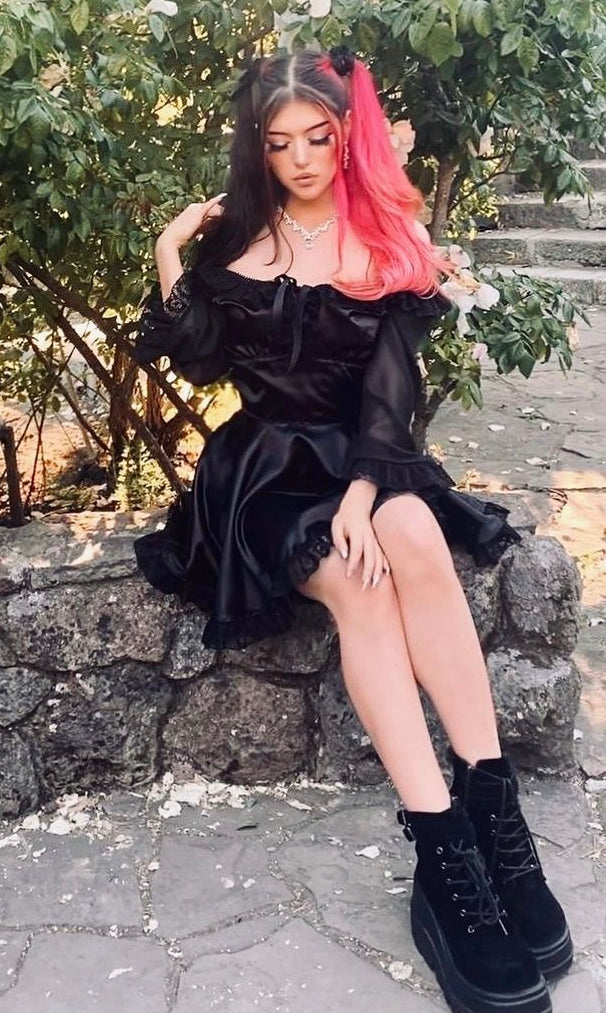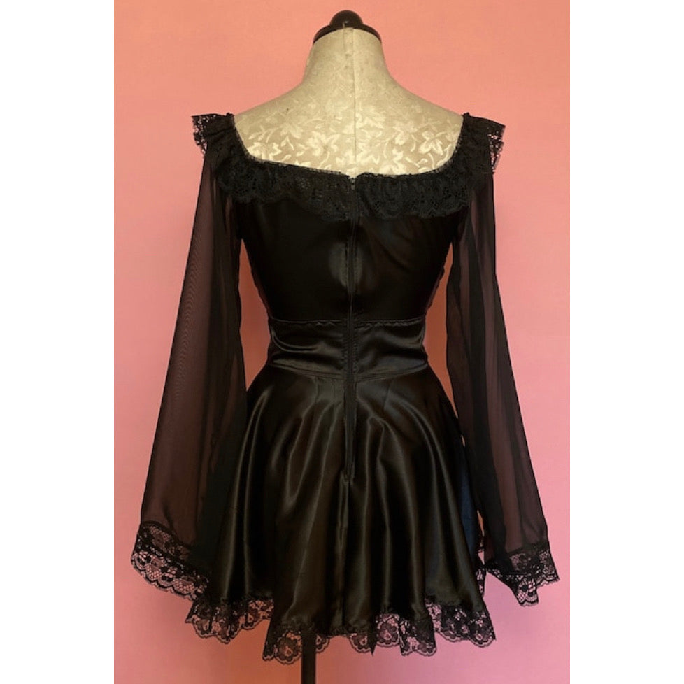 Vintage inspired stretch satin dress with ruffled lace detailing and chiffon sleeves.