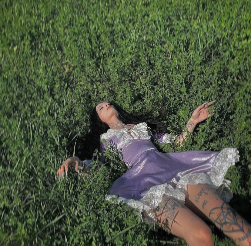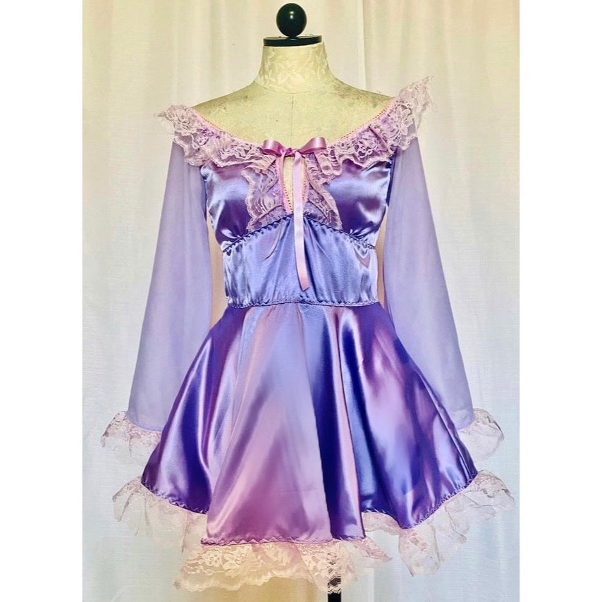 Vintage style off the shoulder dress in stretch charmeuse satin with ruffled lace detailing.