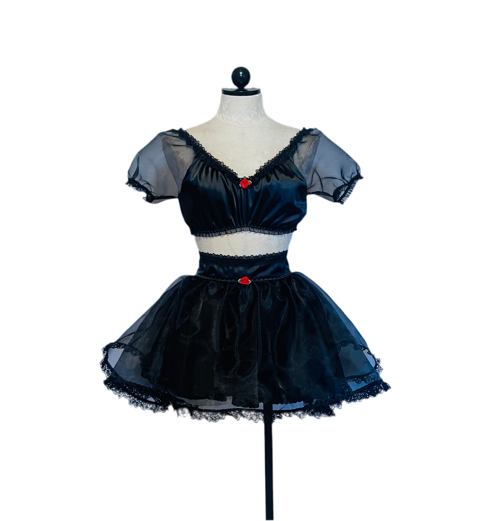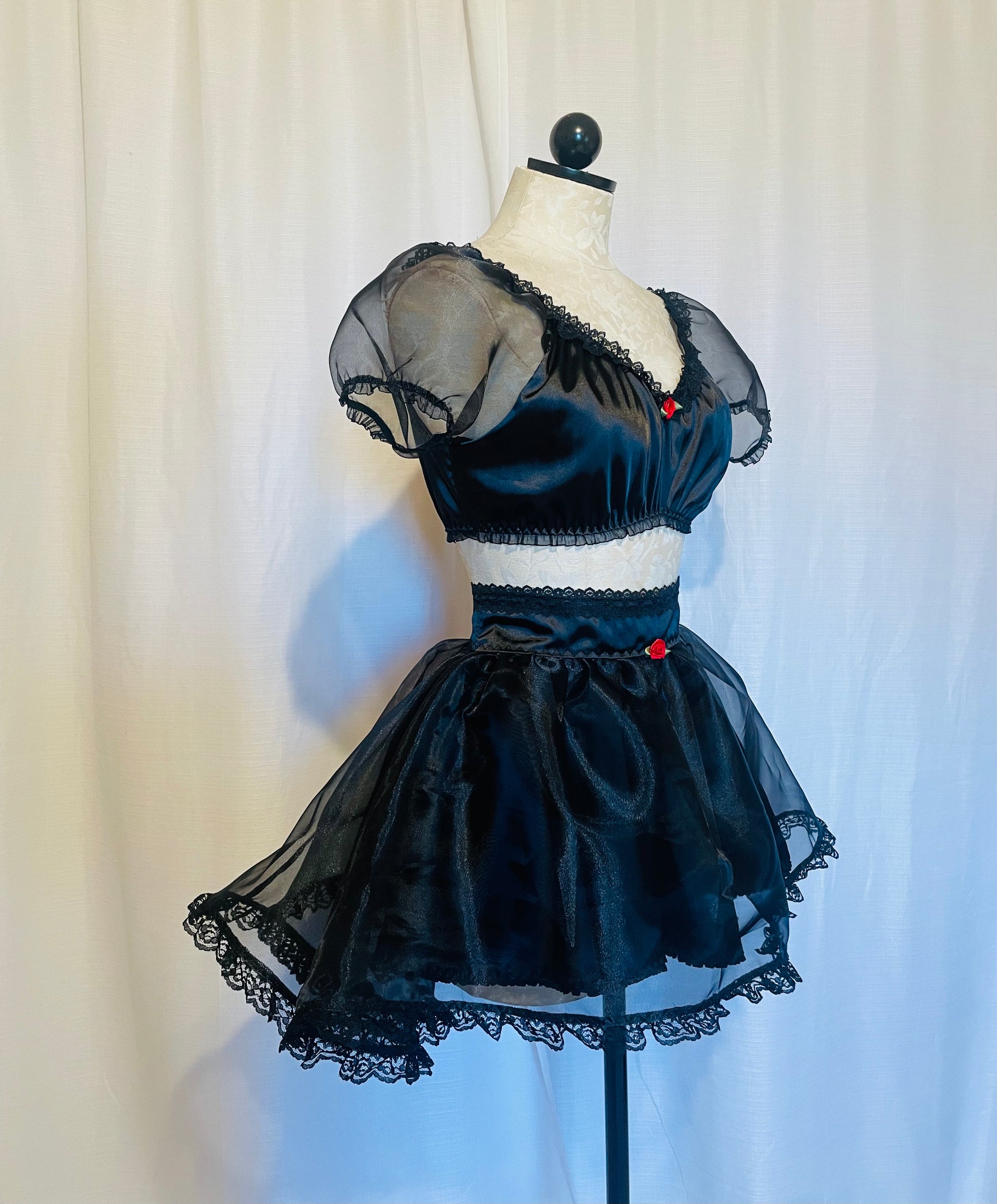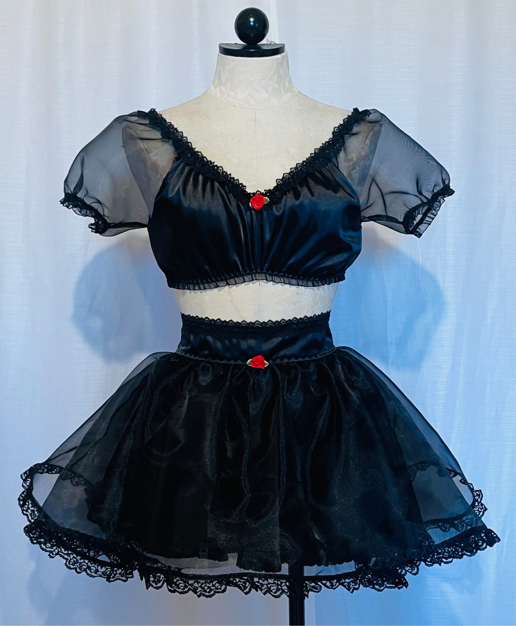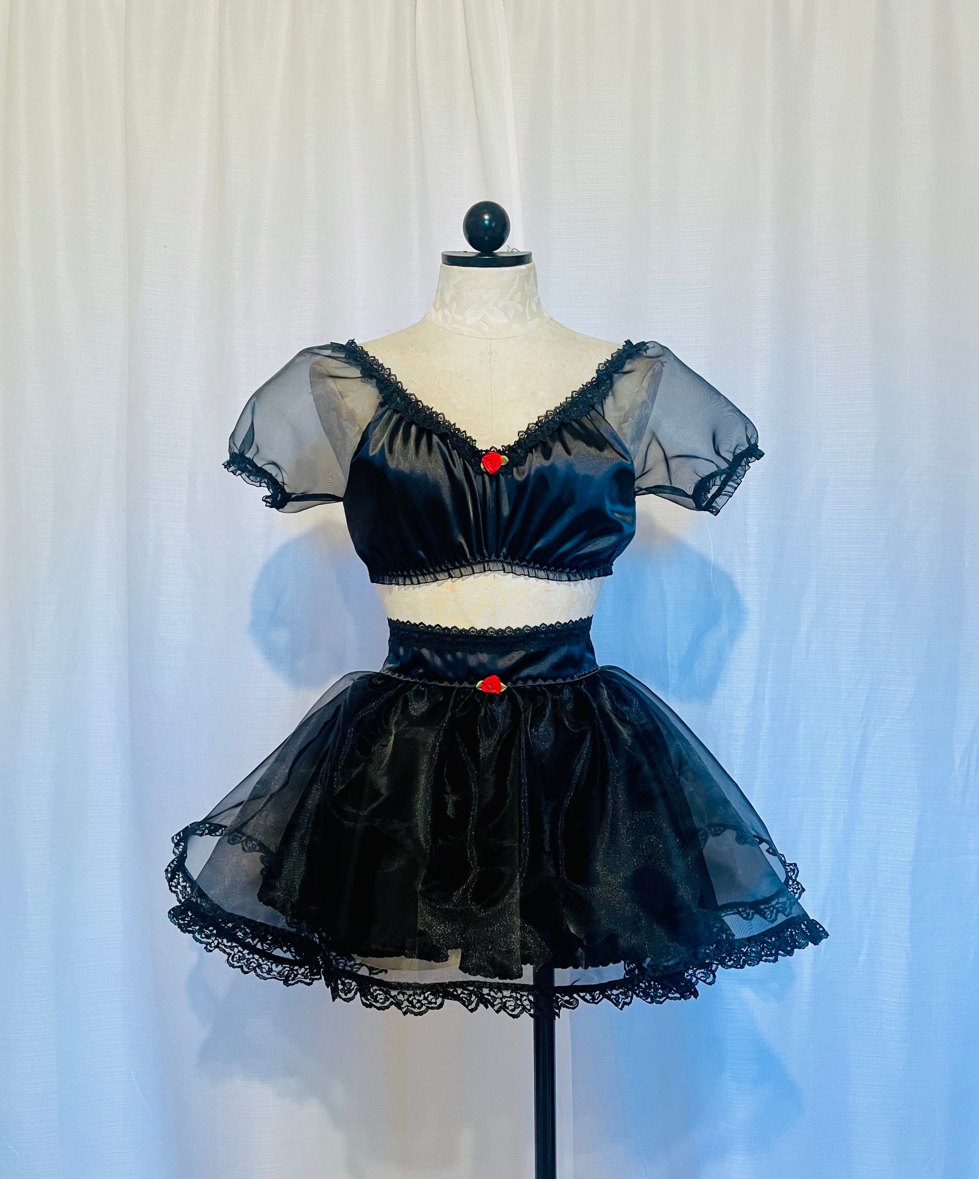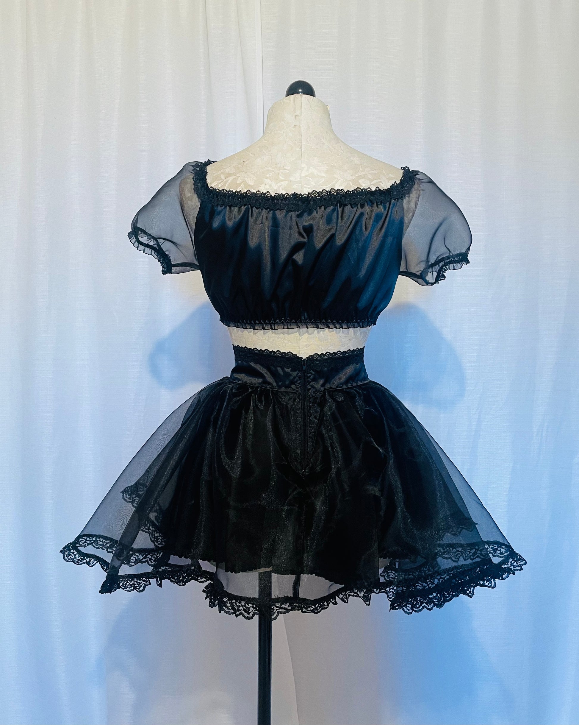 Vintage inspired off shoulder satin and organza crop top with matching circle skirt.