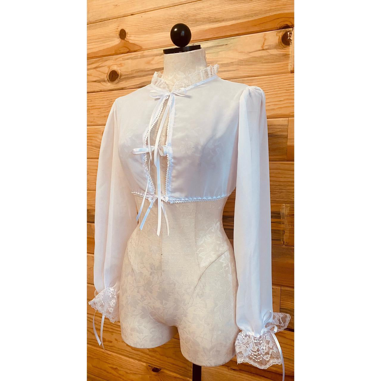 Vintage barmaid inspired two piece set. Chiffon tie crop top with ruffled lace and stretch satin fitted bodice with circle skirt dress