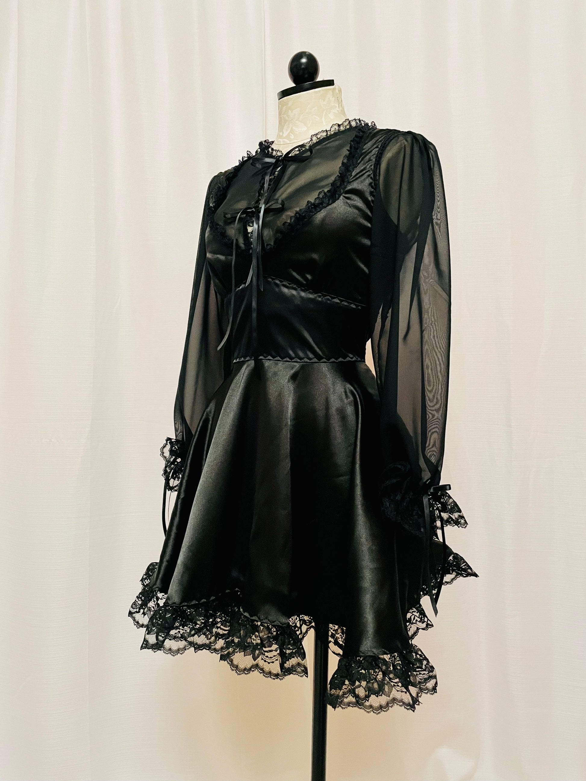Vintage inspired barmaid satin dress with chiffon ribbon closed crop top.