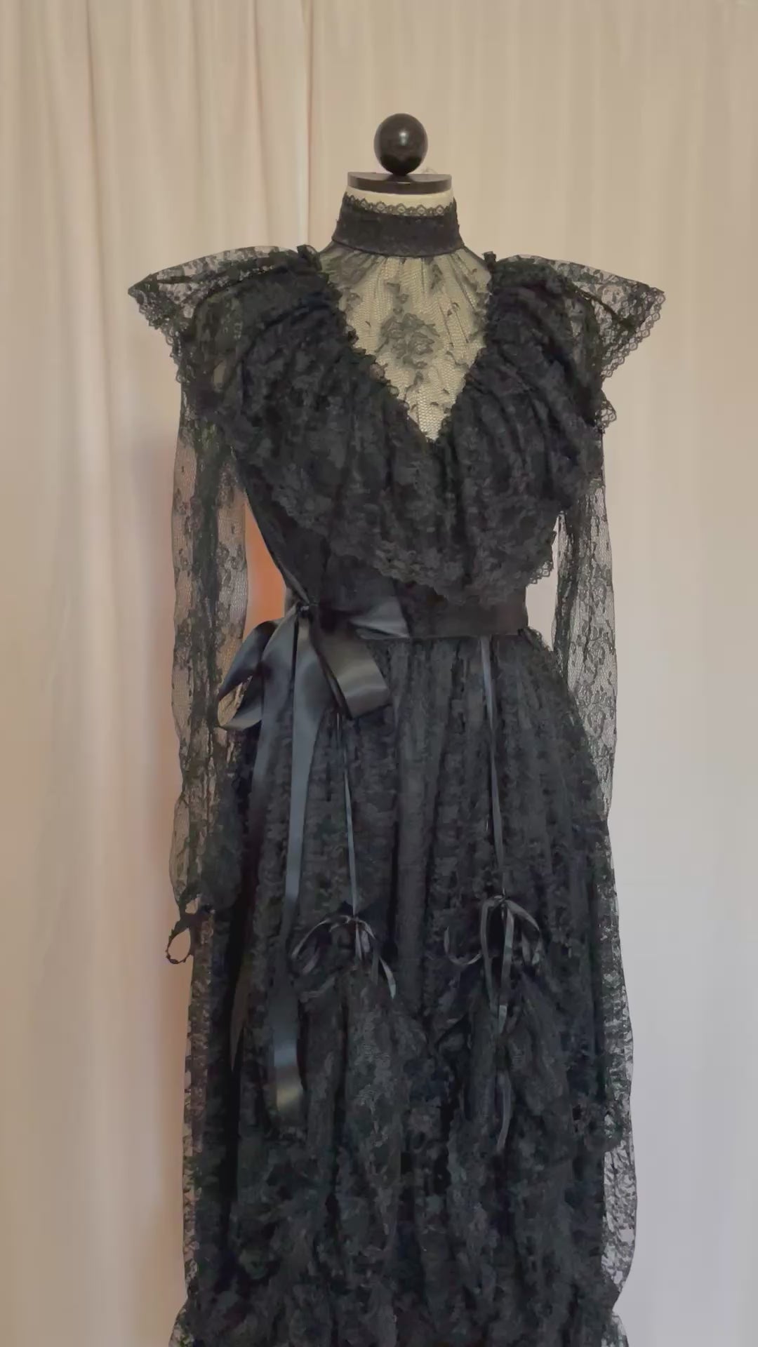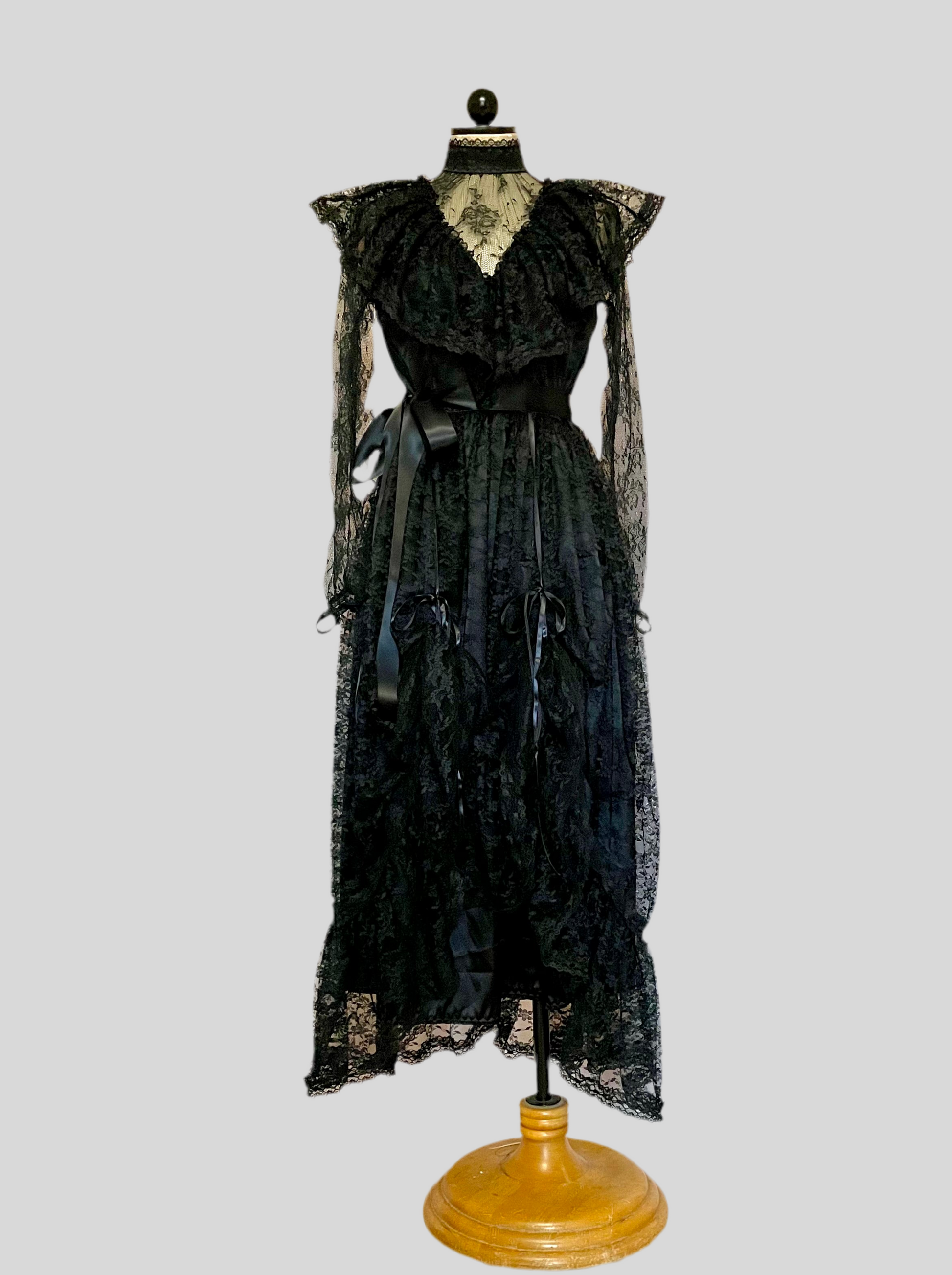 Victorian style lace gown with ruffled details.
