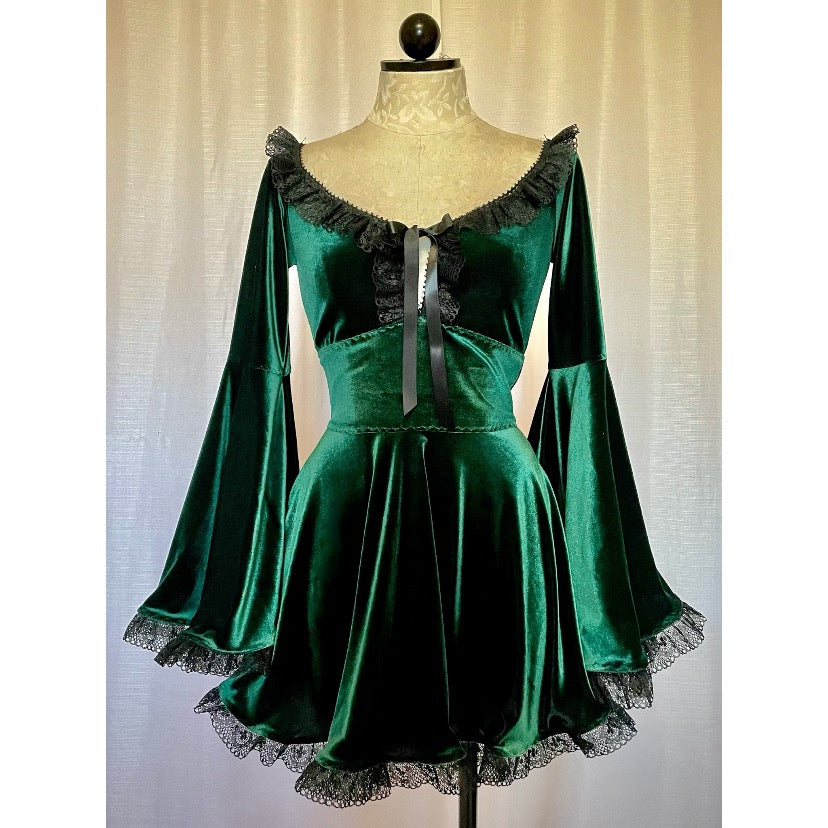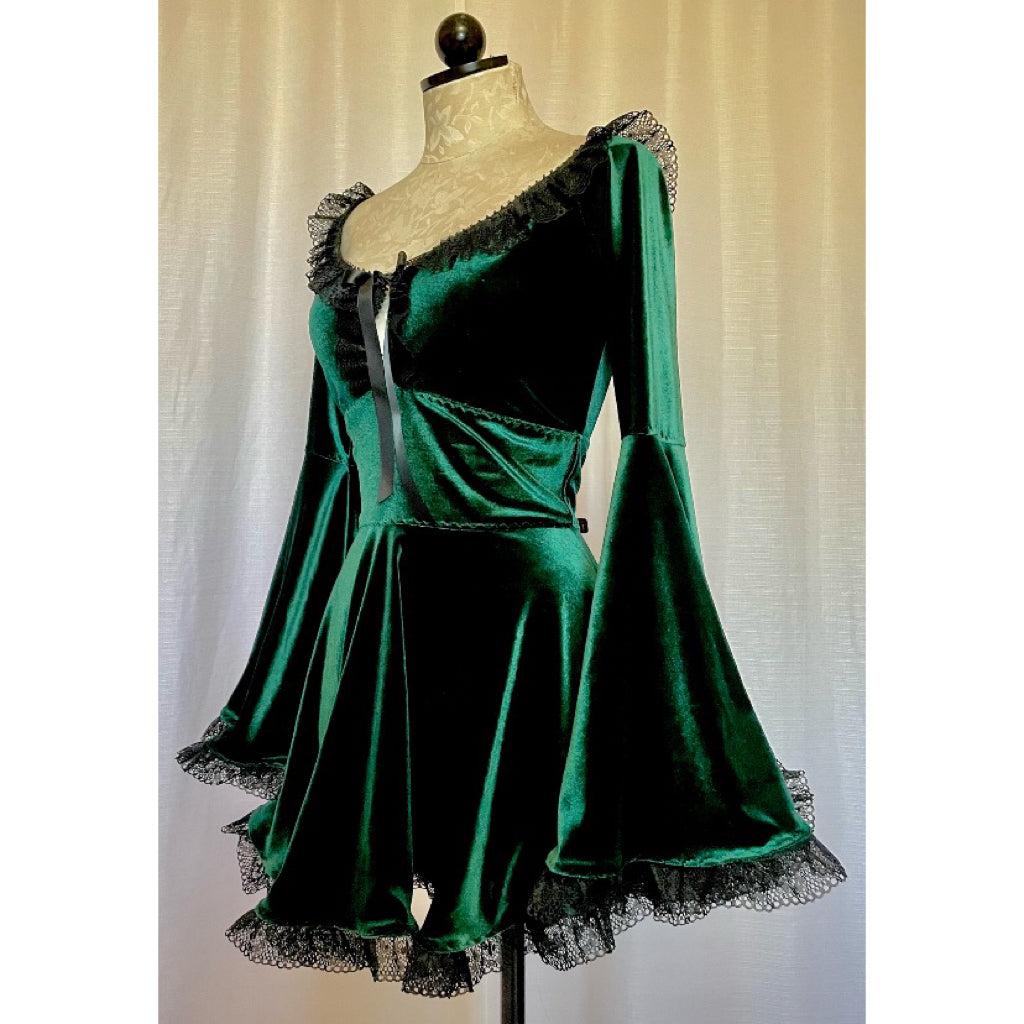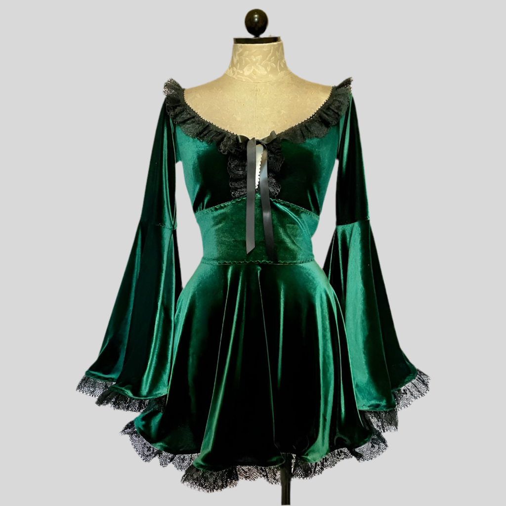 Stretch velvet vintage inspired dress with gorgeous bell sleeves, accentuated with lace and silk details