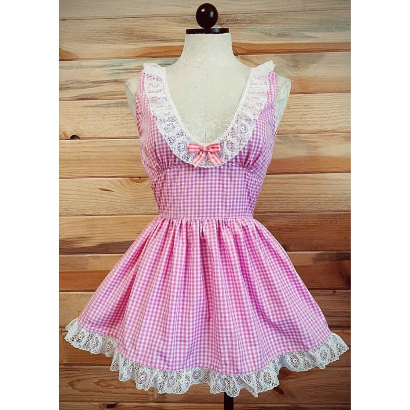 Gingham country style Dress. Cotton scoop neck, with fitted waist and eyelet trim