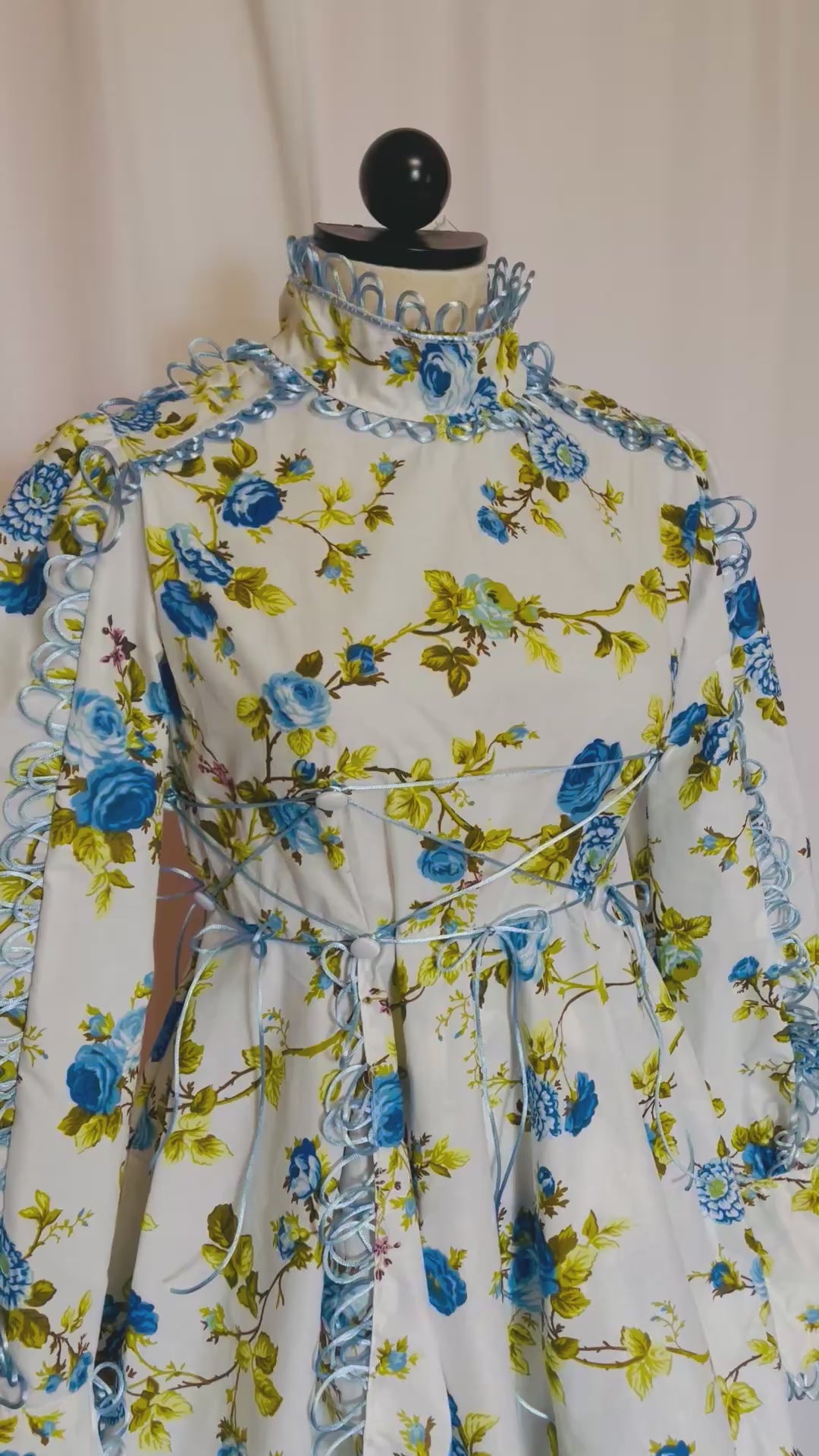 Floral cotton babydoll dress with hand looped trim and waist ribbon corseting ties