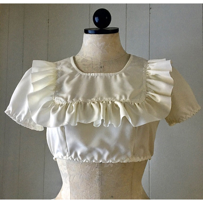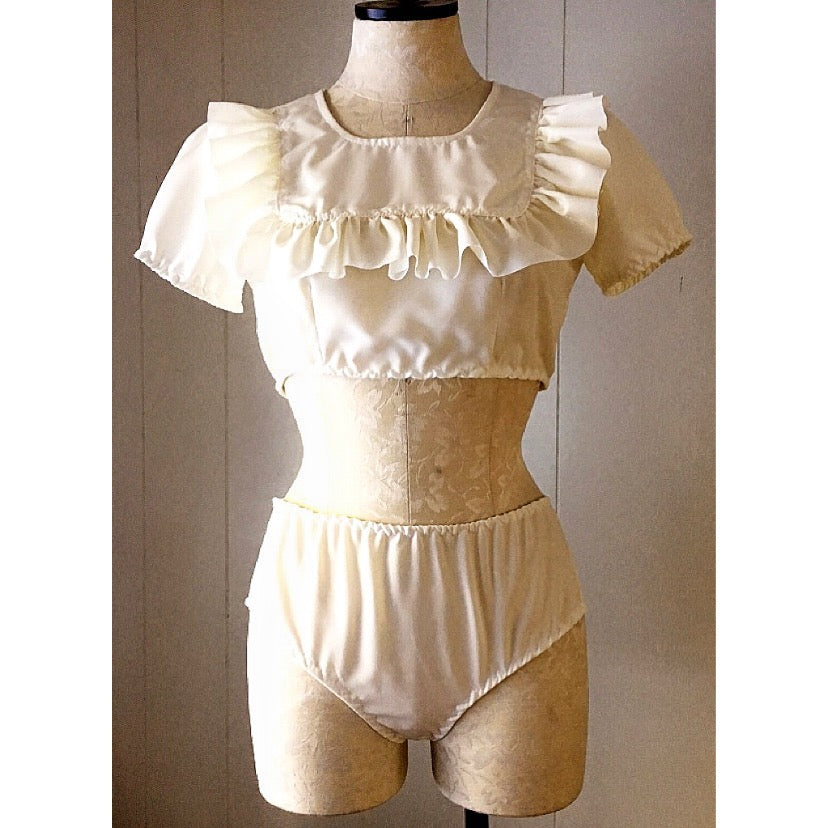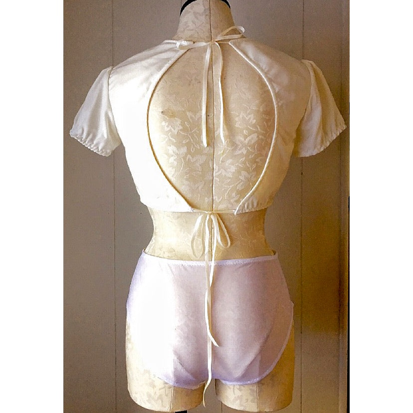 Beautiful ivory microfiber ruffled crop top with open back and matching high waisted mesh backsides brief
